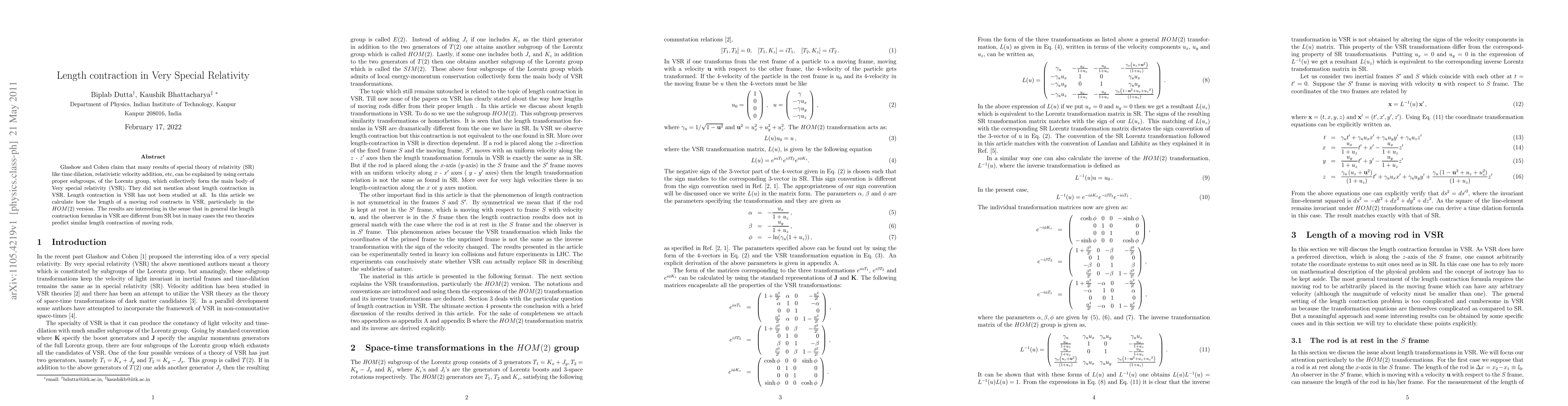 This paper investigates length contraction in Very Special Relativity (VSR), specifically in the HOM(2) version, revealing that while VSR's length contraction differs from that in Special Relativity (SR) in general, there are scenarios where both theories predict similar results.