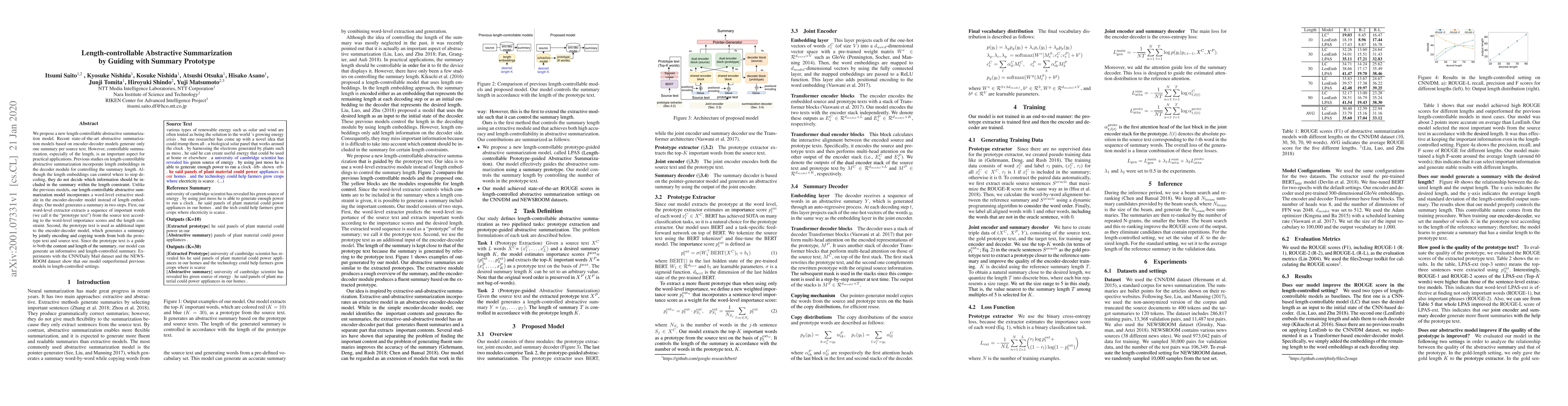 This paper introduces a novel length-controllable abstractive summarization model that uses a word-level extractive module to generate a "prototype text" guiding summary content and length. The prototype text serves as an input to the encoder-decoder model, enabling informative summaries within specified length constraints, outperforming previous models in controlled summarization tasks.