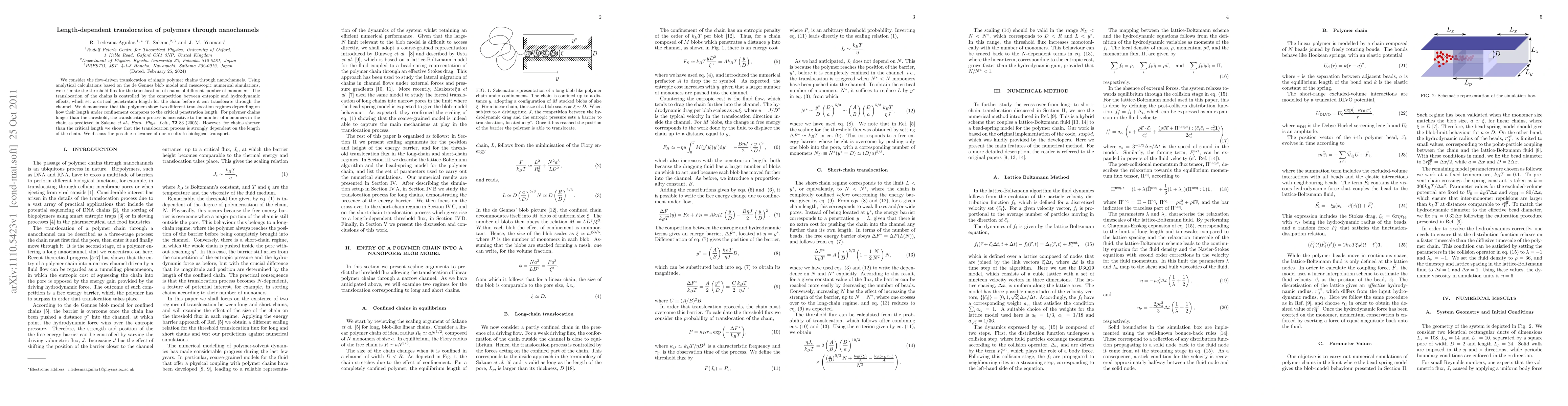This paper investigates the translocation of polymer chains through nanochannels, revealing two distinct regimes based on polymer length relative to a critical penetration length. The study shows that longer chains translocate similarly, while shorter chains exhibit length-dependent translocation, highlighting the interplay of entropic and hydrodynamic effects.