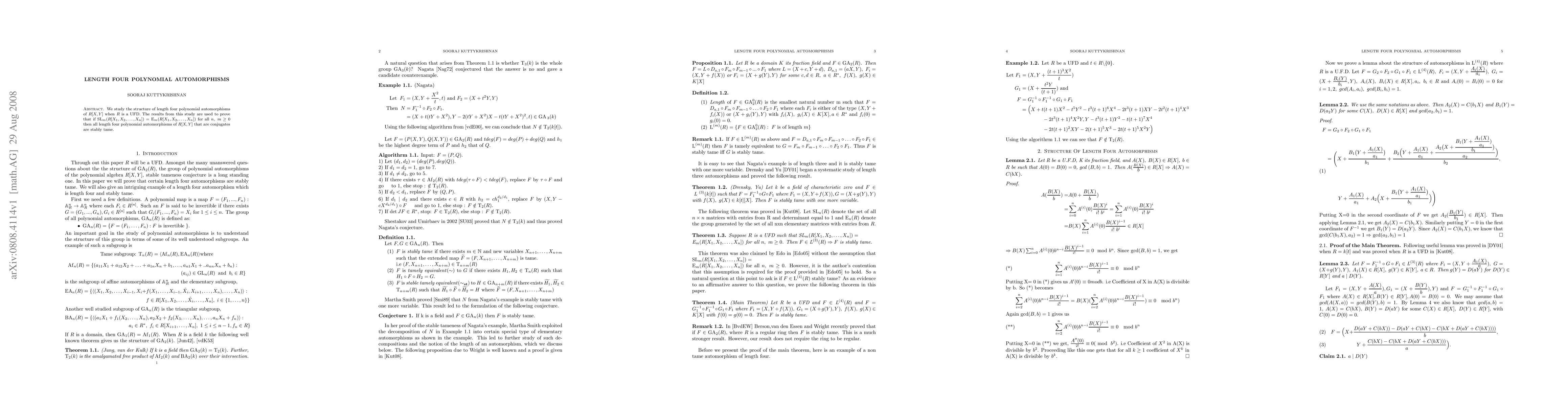 We study the structure of length four polynomial automorphisms of $R[X,Y]$ when $R$ is a UFD. The results from this study are used to prove that if $\text{SL}_m(R[X_1,X_2,..., X_n]) = \text{E}_m(R[X_1,X_2,..., X_n])$ for all $n, m \ge 0$ then all length four polynomial automorphisms of $R[X,Y]$ that are conjugates are stably tame.