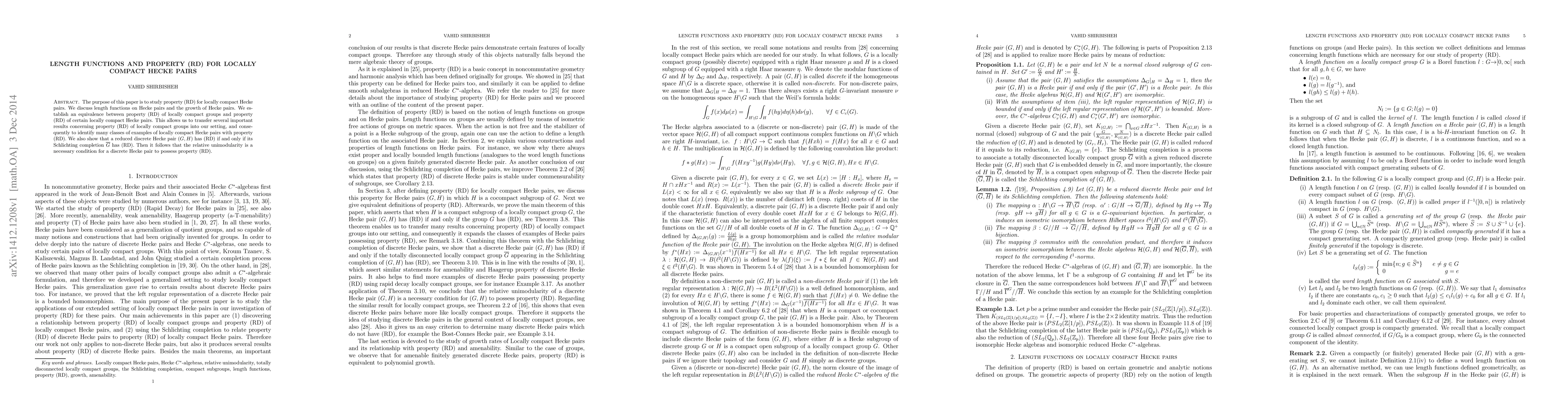 The purpose of this paper is to study property (RD) for locally compact Hecke pairs. We discuss length functions on Hecke pairs and the growth of Hecke pairs. We establish an equivalence between property (RD) of locally compact groups and property (RD) of certain locally compact Hecke pairs. This allows us to transfer several important results concerning property (RD) of locally compact groups into our setting, and consequently to identify many classes of examples of locally compact Hecke pairs with property (RD). We also show that a reduced discrete Hecke pair $(G,H)$ has (RD) if and only if its Schlichting completion $\bar{G}$ has (RD). Then it follows that the relative unimodularity is a necessary condition for a discrete Hecke pair to possess property (RD).