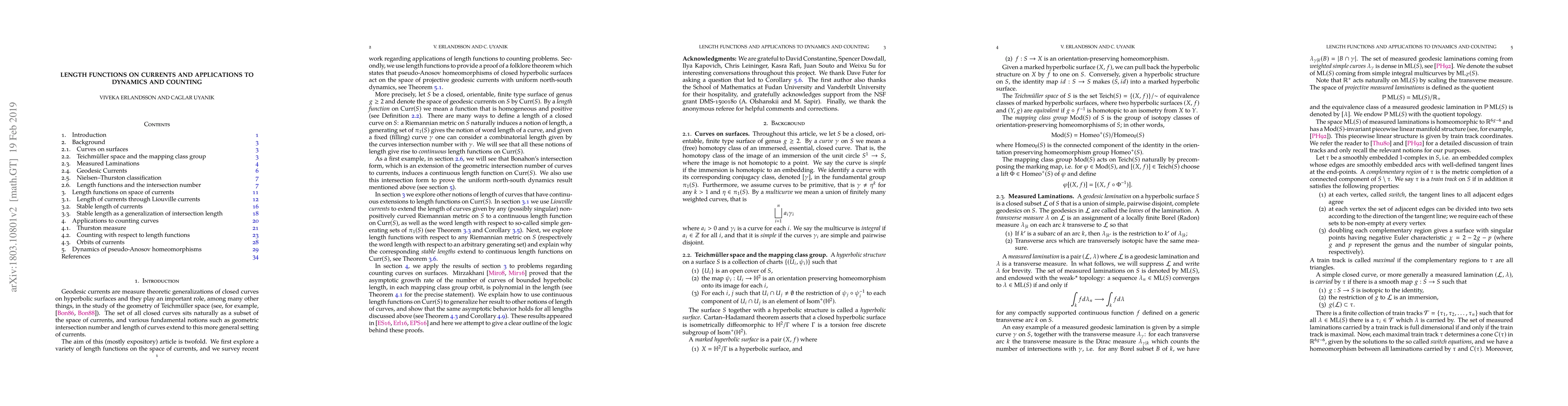 This paper explores length functions on currents in dynamics and counting, providing a proof for a folklore theorem about pseudo-Anosov homeomorphisms on hyperbolic surfaces.