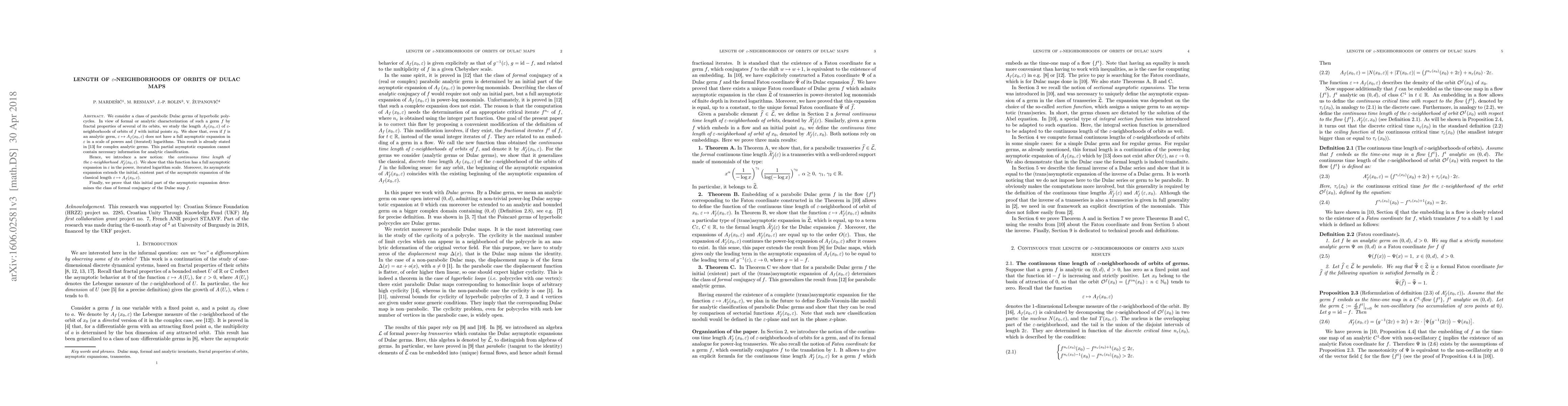 This paper studies the fractal properties of orbits in parabolic Dulac maps, proving the existence of a Fatou coordinate with an asymptotic expansion in transseries. It introduces the concept of continuous time length of ε-neighborhoods of orbits and demonstrates that this length's asymptotic expansion determines the class of formal conjugacy for the map under certain conditions.