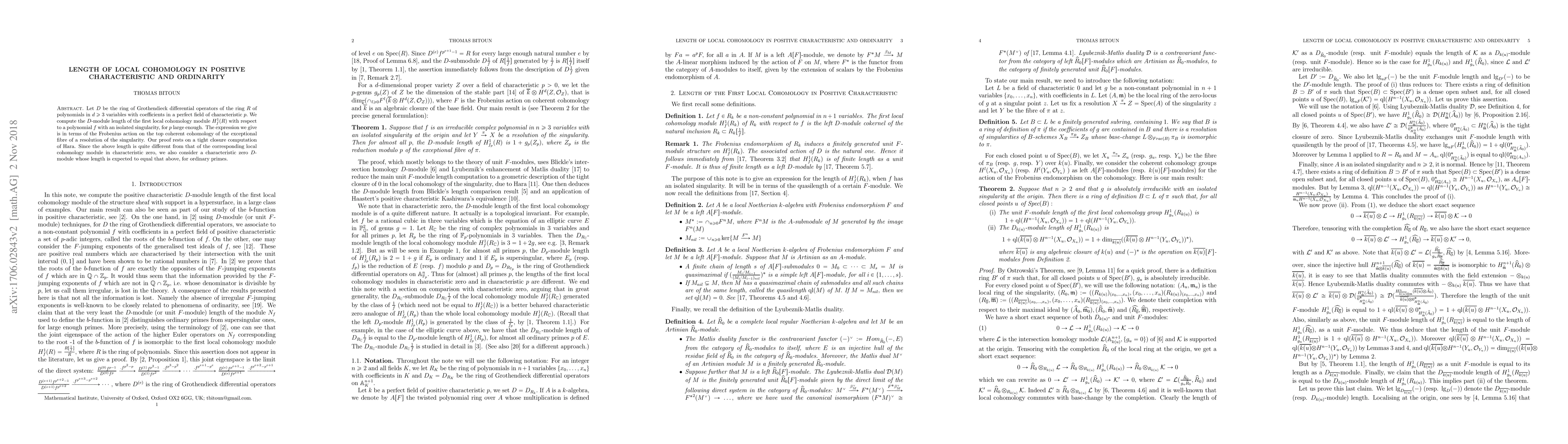 This paper computes the length of the first local cohomology module $H^1_f(R)$ in a positive characteristic setting using Grothendieck differential operators, showing it differs from characteristic zero cases. The result is expressed in terms of the Frobenius action and compared to a characteristic zero $\mathcal{D}$-module for ordinary primes.