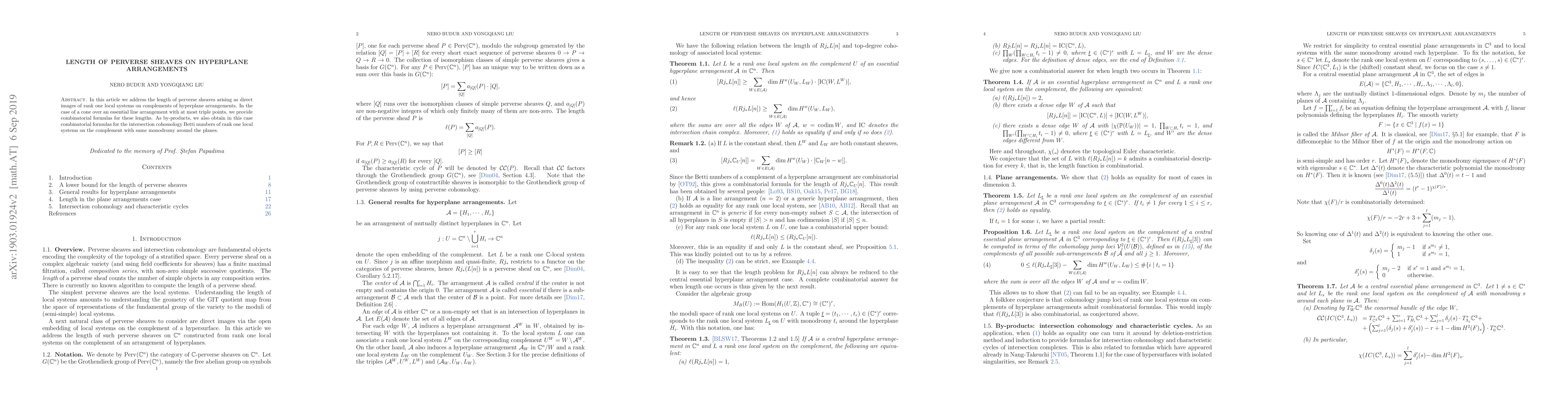 This paper derives combinatorial formulas for the lengths of perverse sheaves from rank one local systems on complements of hyperplane arrangements, specifically for cone over essential line arrangements with at most triple points, and also obtains formulas for the intersection cohomology Betti numbers of these local systems.