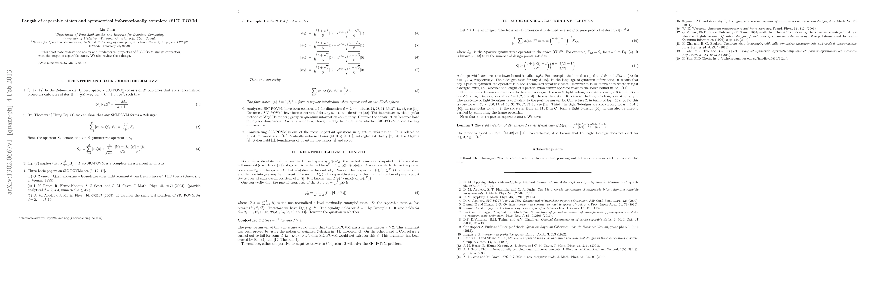 This short note reviews the notion and fundamental properties of SIC-POVM and its connection with the length of separable states. We also review the t-design.