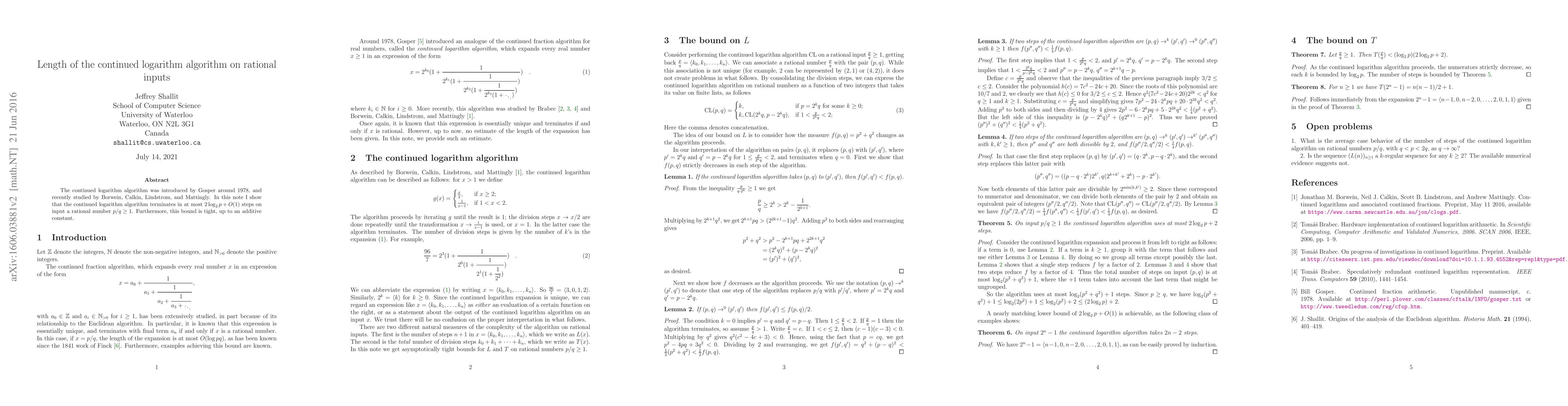The continued logarithm algorithm terminates in at most 2 log_2 p + O(1) steps on rational inputs, with a tight bound up to an additive constant.
