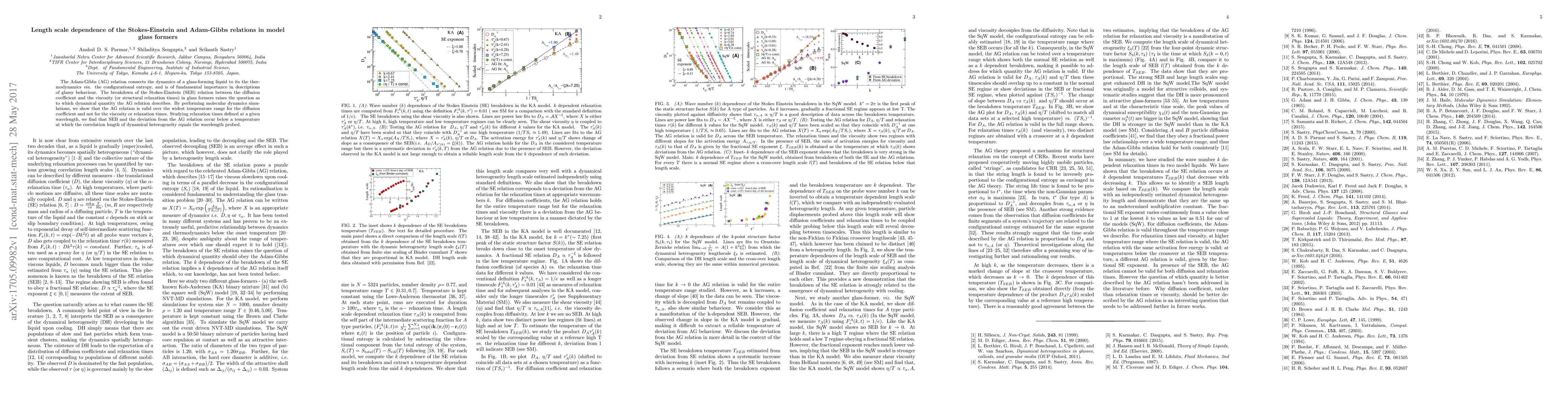 The Adam-Gibbs (AG) relation connects the dynamics of a glass-forming liquid to its the thermodynamics via. the configurational entropy, and is of fundamental importance in descriptions of glassy behaviour. The breakdown of the Stokes-Einstein (SEB) relation between the diffusion coefficient and the viscosity (or structural relaxation times) in glass formers raises the question as to which dynamical quantity the AG relation describes. By performing molecular dynamics simulations, we show that the AG relation is valid over the widest temperature range for the diffusion coefficient and not for the viscosity or relaxation times. Studying relaxation times defined at a given wavelength, we find that SEB and the deviation from the AG relation occur below a temperature at which the correlation length of dynamical heterogeneity equals the wavelength probed.