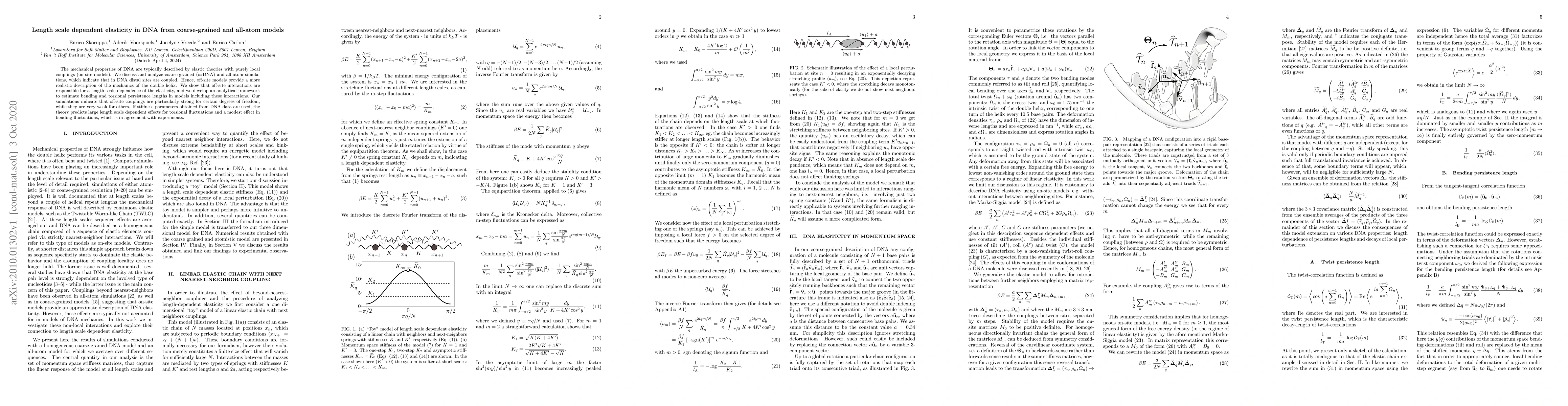 The mechanical properties of DNA are typically described by elastic theories with purely local couplings (on-site models). We discuss and analyze coarse-grained (oxDNA) and all-atom simulations, which indicate that in DNA distal sites are coupled. Hence, off-site models provide a more realistic description of the mechanics of the double helix. We show that off-site interactions are responsible for a length scale dependence of the elasticity, and we develop an analytical framework to estimate bending and torsional persistence lengths in models including these interactions. Our simulations indicate that off-site couplings are particularly strong for certain degrees of freedom, while they are very weak for others. If stiffness parameters obtained from DNA data are used, the theory predicts large length scale dependent effects for torsional fluctuations and a modest effect in bending fluctuations, which is in agreement with experiments.