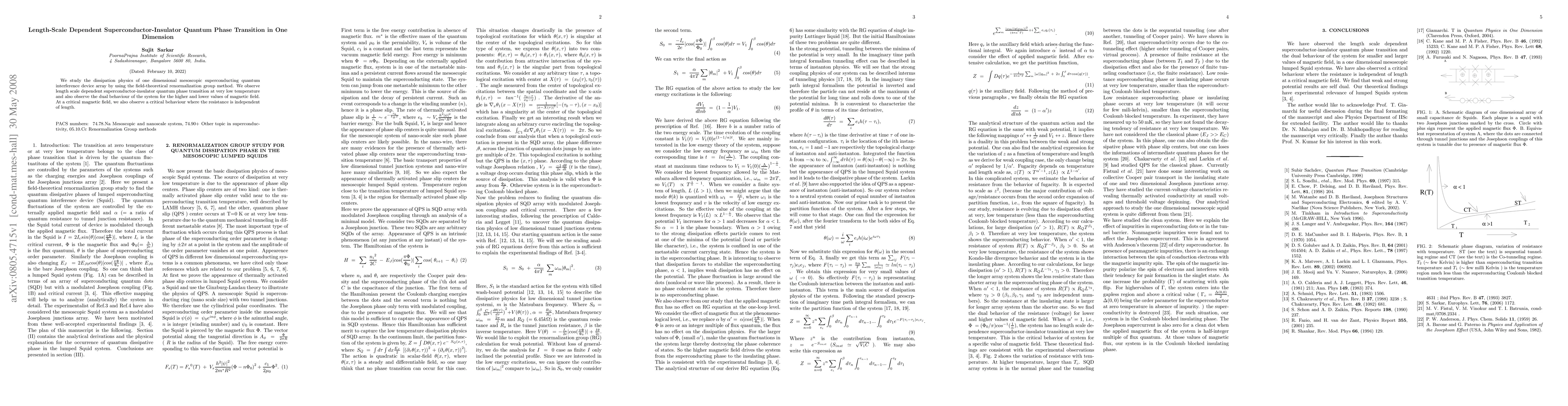 We study the dissipation physics of one dimensional mesoscopic superconducting quantum interference device array by using the field-theoretical renormalization group method. We observe length scale dependent superconductor-insulator quantum phase transition at very low temperature and also observe the dual behaviour of the system for the higher and lower values of magnetic field. At a critical magnetic field, we also observe a critical behaviour where the resistance is independent of length.