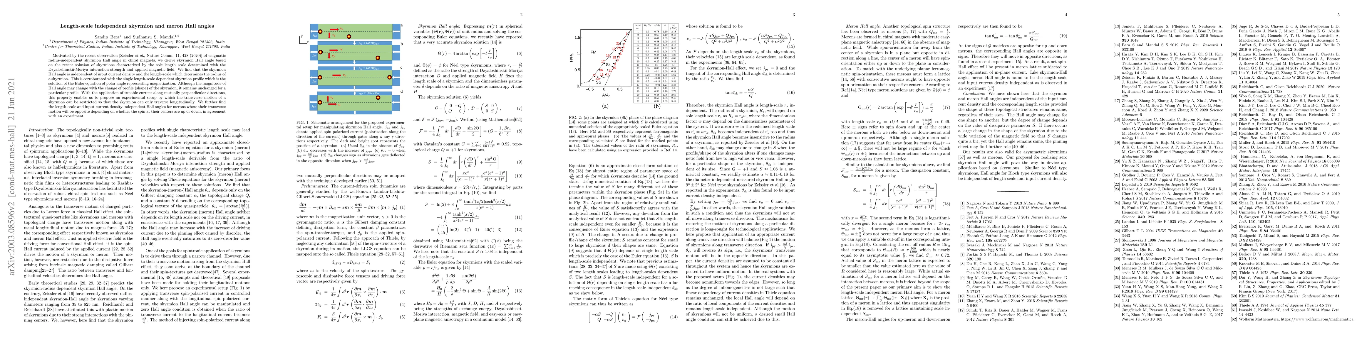 This paper derives the length-scale independent skyrmion Hall angle in chiral magnets, showing it is unaffected by current density or skyrmion radius, and proposes a method to restrict skyrmion motion. It also finds similar independent Hall angles for merons, whose transverse motion direction depends on their central spin orientation.