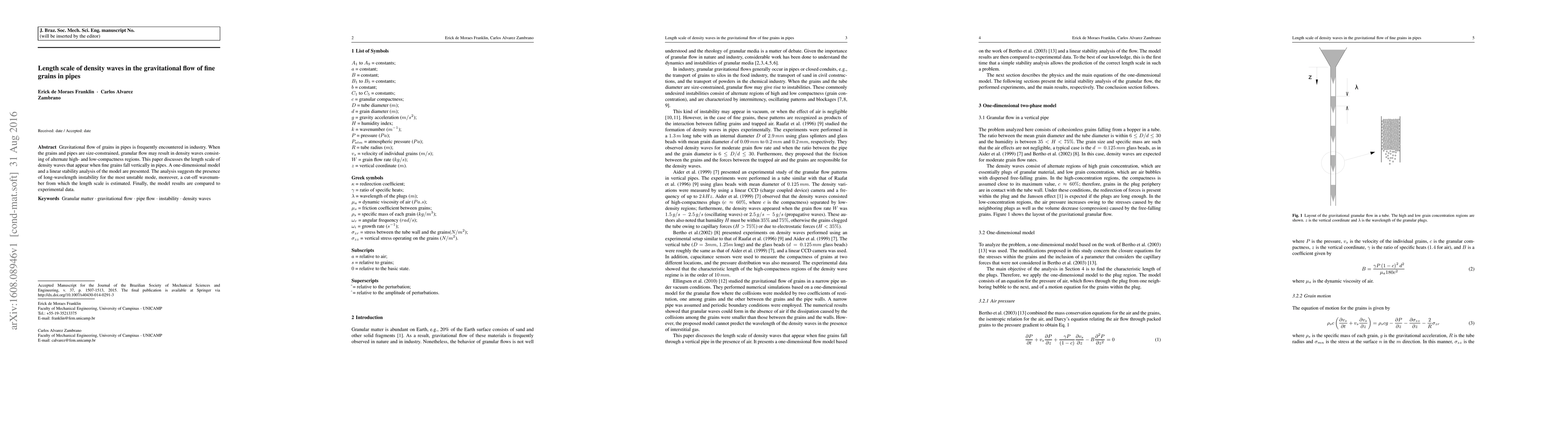 This paper investigates the length scale of density waves in the gravitational flow of fine grains in pipes, employing a one-dimensional model and linear stability analysis to identify long-wavelength instabilities. Experimental data is used to validate the model's predictions.