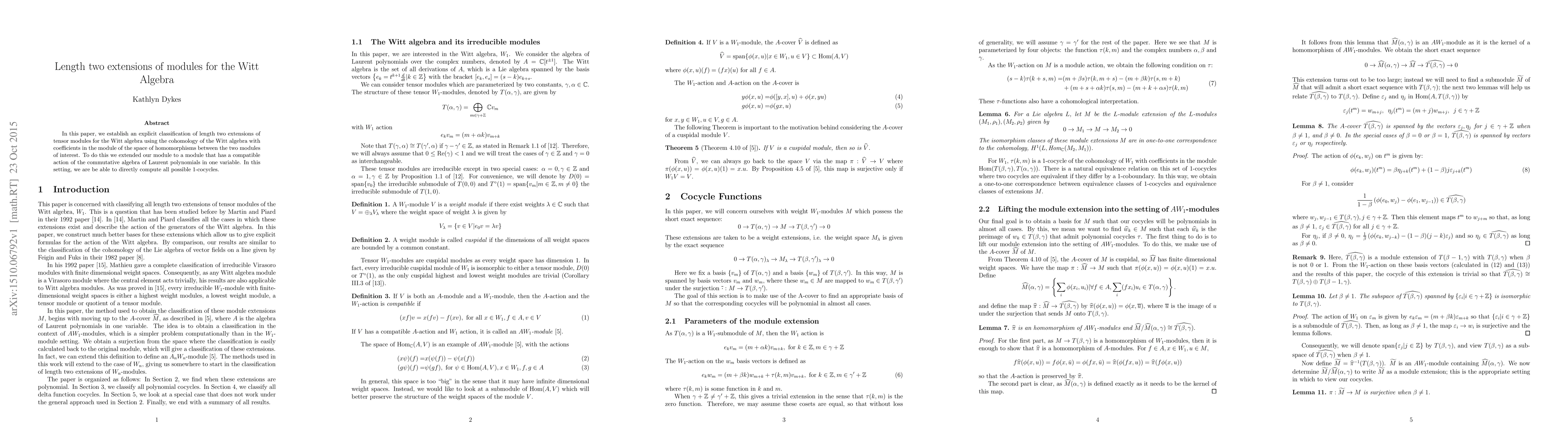 Summary: This paper classifies length two extensions of tensor modules for the Witt algebra through the computation of cohomology, leveraging the action of Laurent polynomials, and directly calculating 1-cocycles. The results provide an explicit framework for understanding these module extensions.