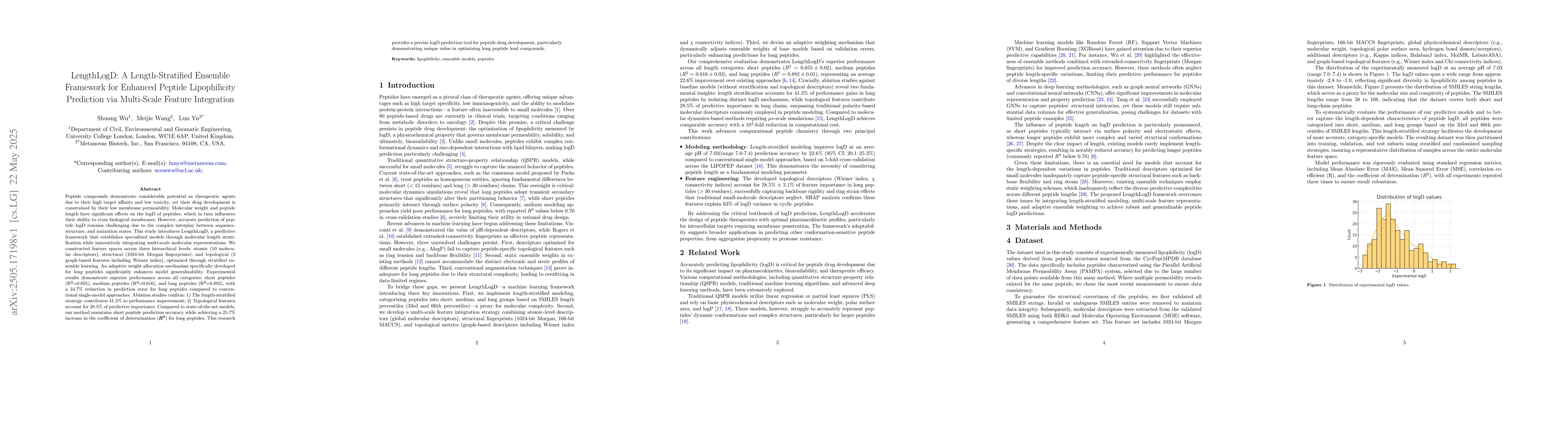 The research introduces LengthLogD, a predictive framework for peptide lipophilicity that stratifies models by molecular length and integrates multi-scale molecular representations. It constructs feature spaces across atomic, structural, and topological levels, optimized through stratified ensemble learning with an adaptive weight allocation mechanism for long peptides.
