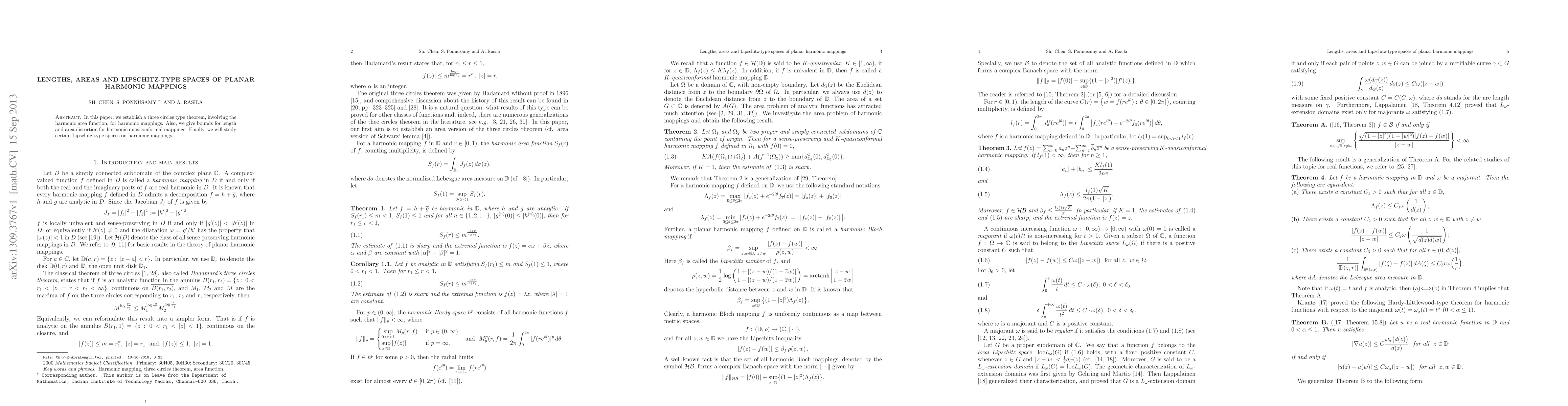 Summary: The paper establishes a three circles theorem for harmonic mappings, provides bounds for length and area distortion in harmonic quasiconformal mappings, and explores Lipschitz-type spaces related to harmonic mappings.