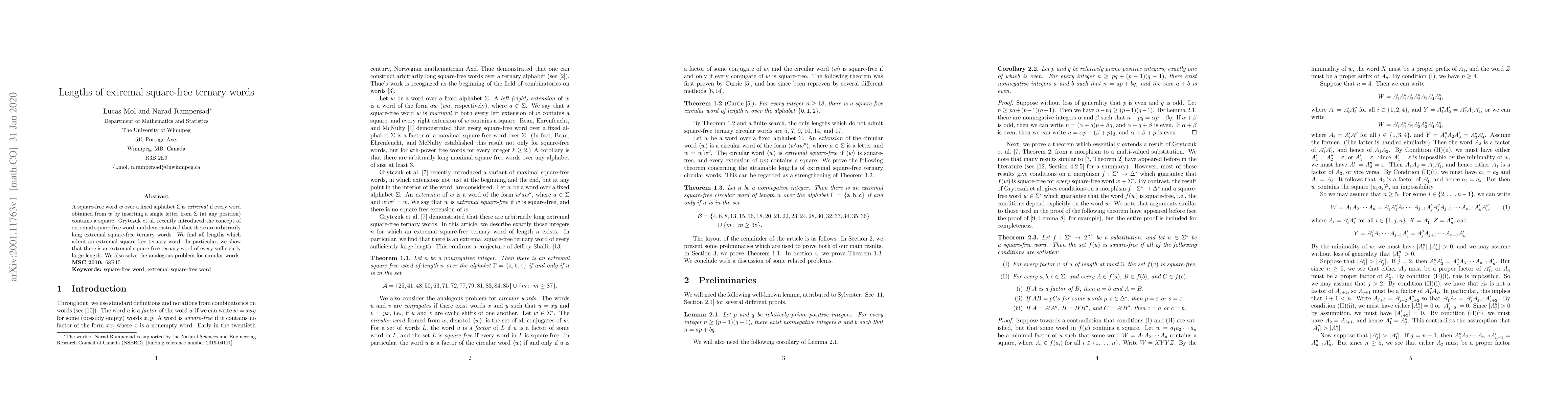 This paper identifies all lengths that can accommodate an extremal square-free ternary word, demonstrating that such words exist for every sufficiently large length. Additionally, it addresses the analogous problem for circular words.