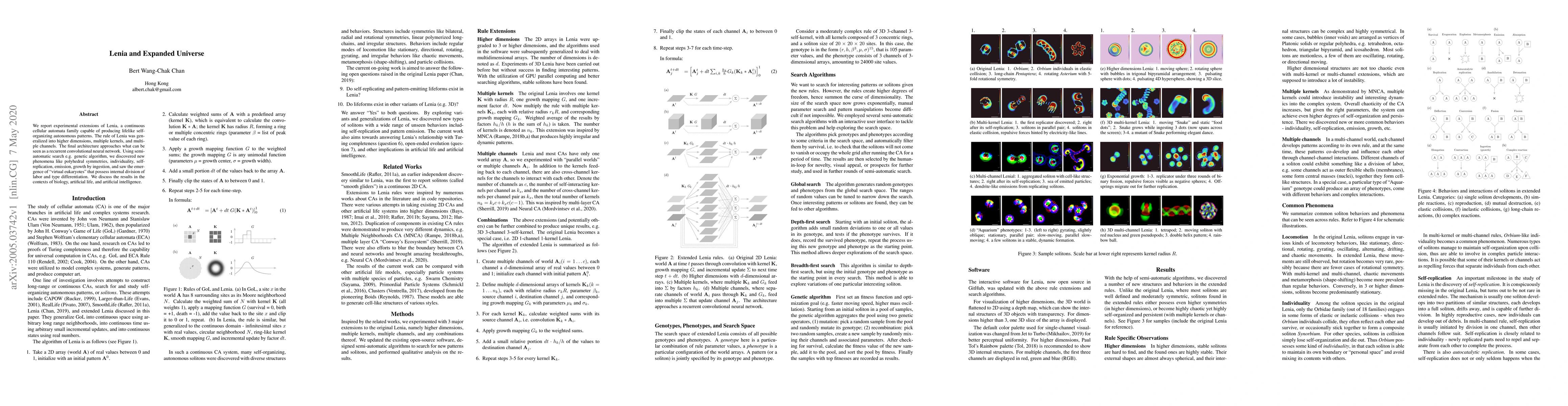 This paper extends Lenia, a continuous cellular automata system, into higher dimensions and multiple channels, discovering new phenomena such as polyhedral symmetries and self-replication through semi-automatic search. The findings suggest potential parallels in biology, artificial life, and artificial intelligence.