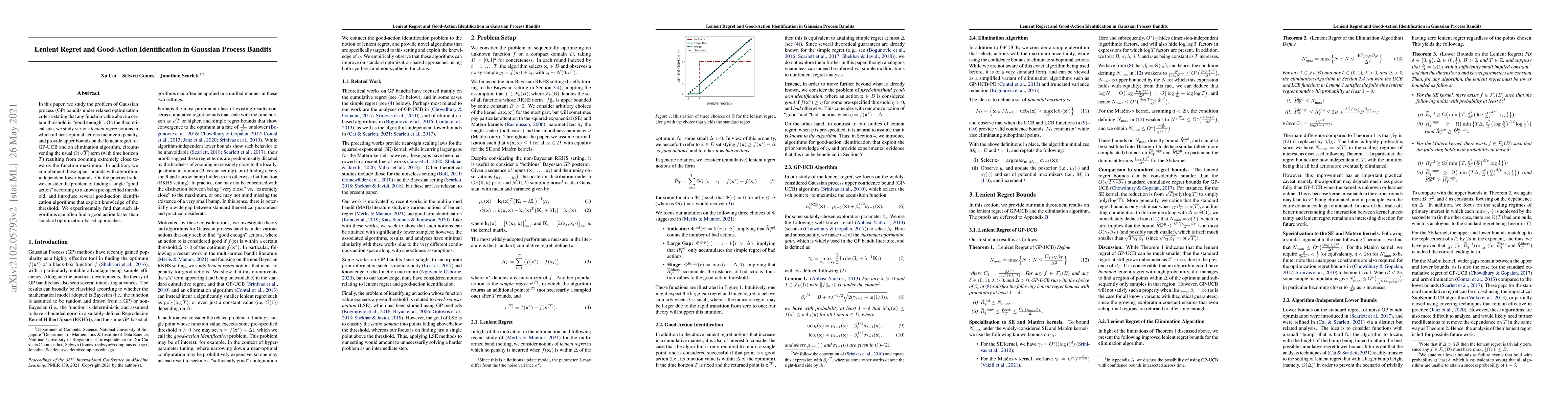 This paper investigates Gaussian process (GP) bandits under relaxed optimization criteria, focusing on lenient regret and the identification of good actions. It provides upper bounds on lenient regret for GP-UCB and an elimination algorithm, and introduces algorithms for identifying good actions that can outperform standard optimization methods.