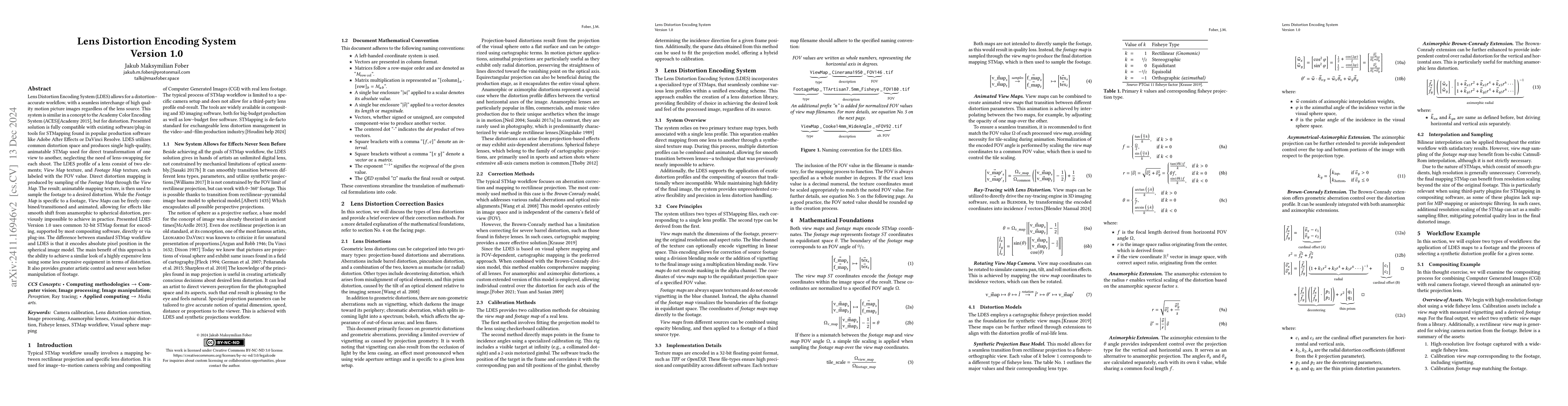 The Lens Distortion Encoding System (LDES) Version 1.0 enables distortion-accurate workflows for high-quality motion pictures, allowing seamless interchange of images across different lenses. It uses a common distortion space and animatable STMaps to transform one lens view to another without lens-swapping.