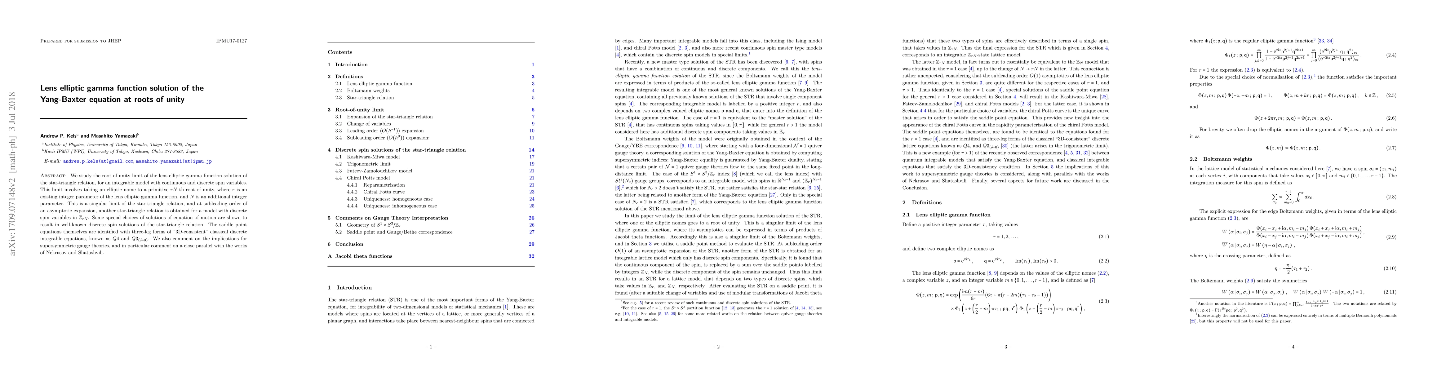 We study the root of unity limit of the lens elliptic gamma function solution of the star-triangle relation, for an integrable model with continuous and discrete spin variables. This limit involves taking an elliptic nome to a primitive $rN$-th root of unity, where $r$ is an existing integer parameter of the lens elliptic gamma function, and $N$ is an additional integer parameter. This is a singular limit of the star-triangle relation, and at subleading order of an asymptotic expansion, another star-triangle relation is obtained for a model with discrete spin variables in $\mathbb{Z}_{rN}$. Some special choices of solutions of equation of motion are shown to result in well-known discrete spin solutions of the star-triangle relation. The saddle point equations themselves are identified with three-leg forms of "3D-consistent" classical discrete integrable equations, known as $Q4$ and $Q3_{(\delta=0)}$. We also comment on the implications for supersymmetric gauge theories, and in particular comment on a close parallel with the works of Nekrasov and Shatashvili.
