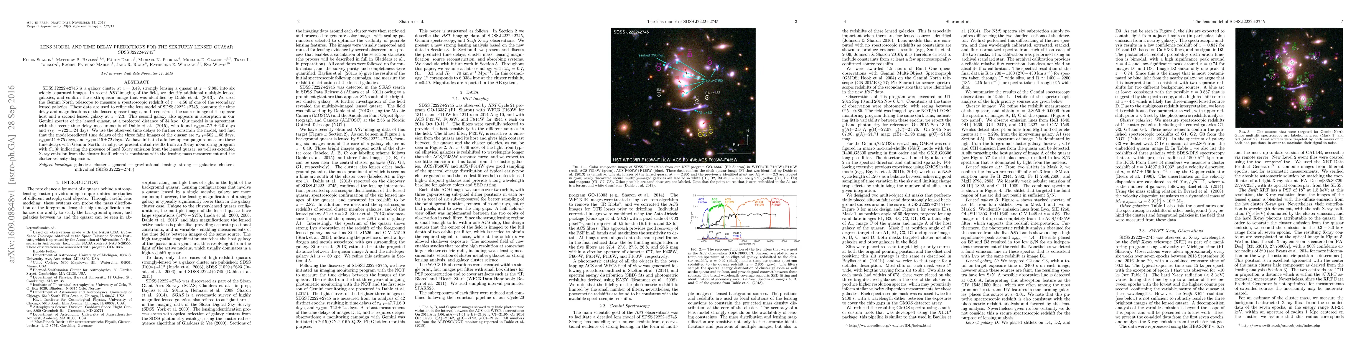 SDSS J2222+2745 is a galaxy cluster at z=0.49, strongly lensing a quasar at z=2.805 into six widely separated images. In recent HST imaging of the field, we identify additional multiply lensed galaxies, and confirm the sixth quasar image that was identified by Dahle et al. (2013). We used the Gemini North telescope to measure a spectroscopic redshift of z=4.56 of one of the secondary lensed galaxies. These data are used to refine the lens model of SDSS J2222+2745, compute the time delay and magnifications of the lensed quasar images, and reconstruct the source image of the quasar host and a second lensed galaxy at z=2.3. This second galaxy also appears in absorption in our Gemini spectra of the lensed quasar, at a projected distance of 34 kpc. Our model is in agreement with the recent time delay measurements of Dahle et al. (2015), who found tAB=47.7+/-6.0 days and tAC=-722+/-24 days. We use the observed time delays to further constrain the model, and find that the model-predicted time delays of the three faint images of the quasar are tAD=502+/-68 days, tAE=611+/-75 days, and tAF=415+/-72 days. We have initiated a follow-up campaign to measure these time delays with Gemini North. Finally, we present initial results from an X-ray monitoring program with Swift, indicating the presence of hard X-ray emission from the lensed quasar, as well as extended X-ray emission from the cluster itself, which is consistent with the lensing mass measurement and the cluster velocity dispersion.