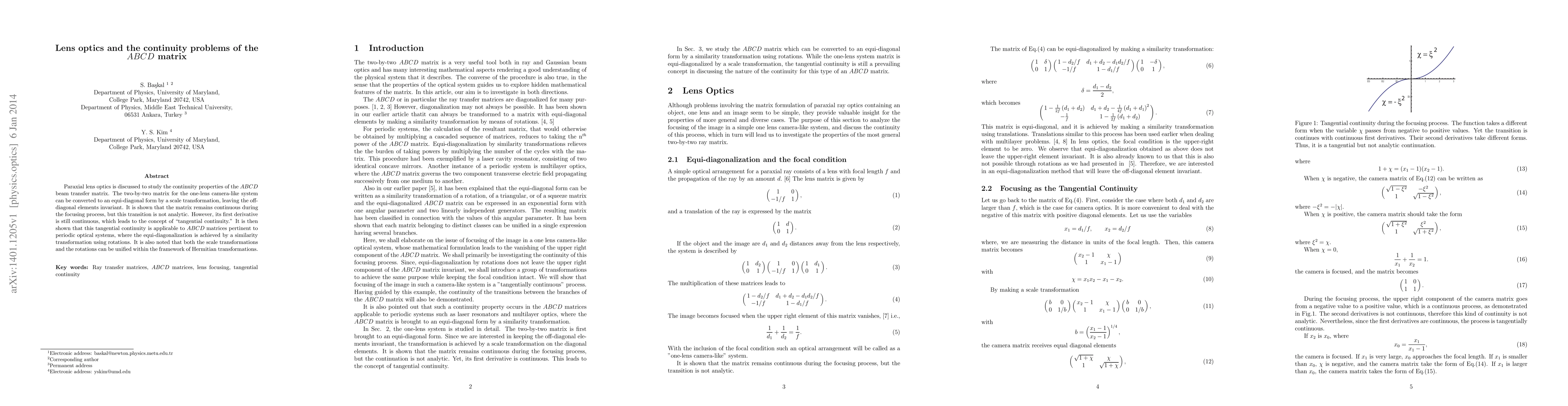 This paper investigates the continuity properties of the ABCD matrix in paraxial lens optics, demonstrating that while the matrix remains continuous during focusing, the transition is not analytic. It introduces the concept of "tangential continuity" and shows its applicability to periodic optical systems through equi-diagonalization and Hermitian transformations.
