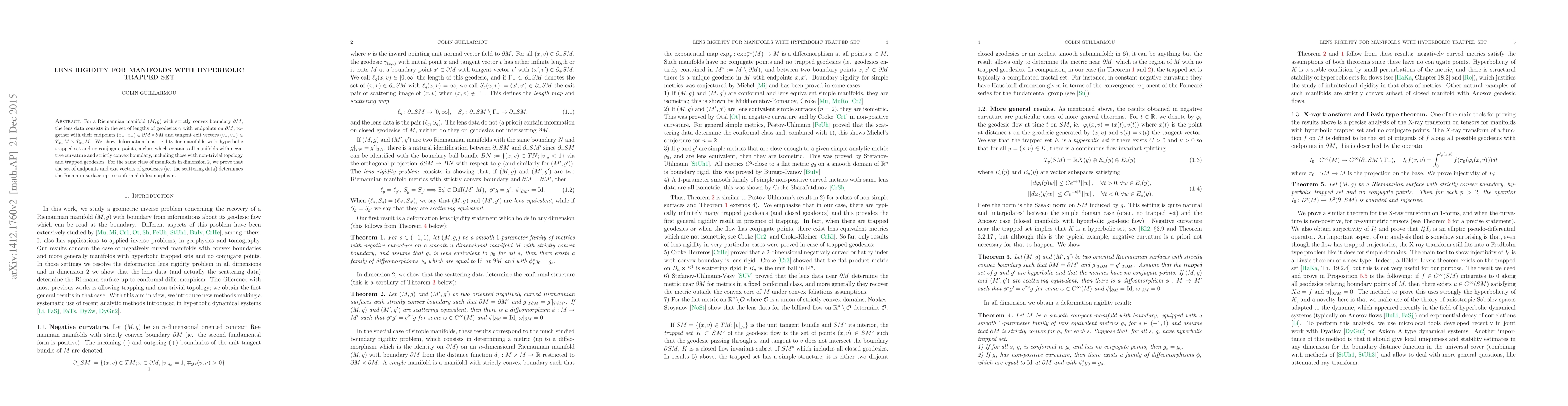 For a Riemannian manifold $(M,g)$ with strictly convex boundary $\partial M$, the lens data consists in the set of lengths of geodesics $\gamma$ with endpoints on $\partial M$, together with their endpoints $(x_-,x_+)\in \partial M\times \partial M$ and tangent exit vectors $(v_-,v_+)\in T_{x_-} M\times T_{x_+} M$. We show deformation lens rigidity for a large class of manifolds which includes all manifolds with negative curvature and strictly convex boundary, possibly with non-trivial topology and trapped geodesics. For the same class of manifolds in dimension $2$, we prove that the set of endpoints and exit vectors of geodesics (ie. the scattering data) determines the topology and the conformal class of the surface.