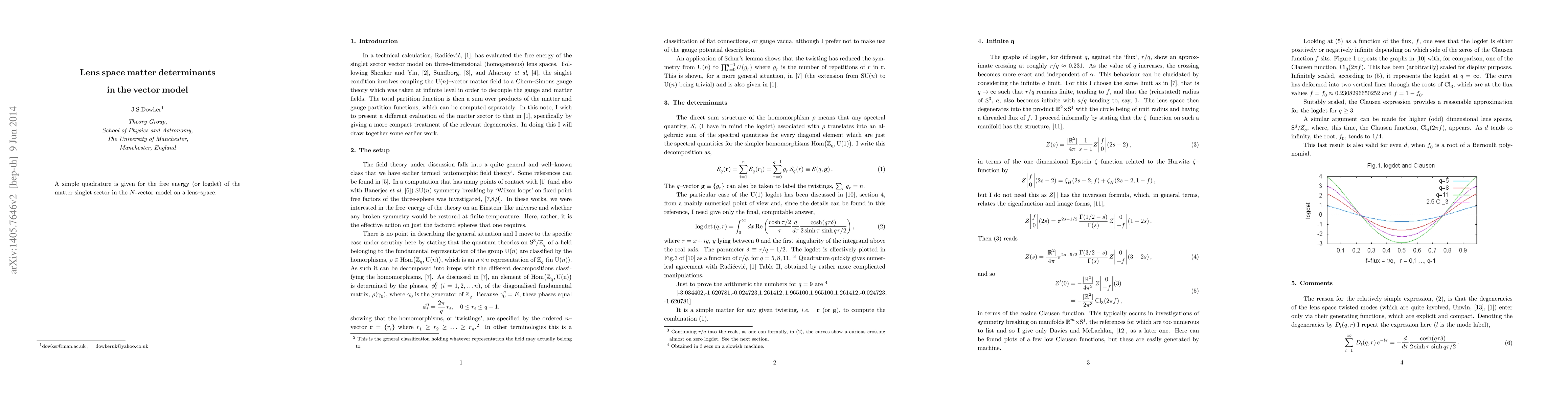 A simple quadrature is given for the free energy (or logdet) of the matter singlet sector in the N-vector model on homogeneous lens spaces.