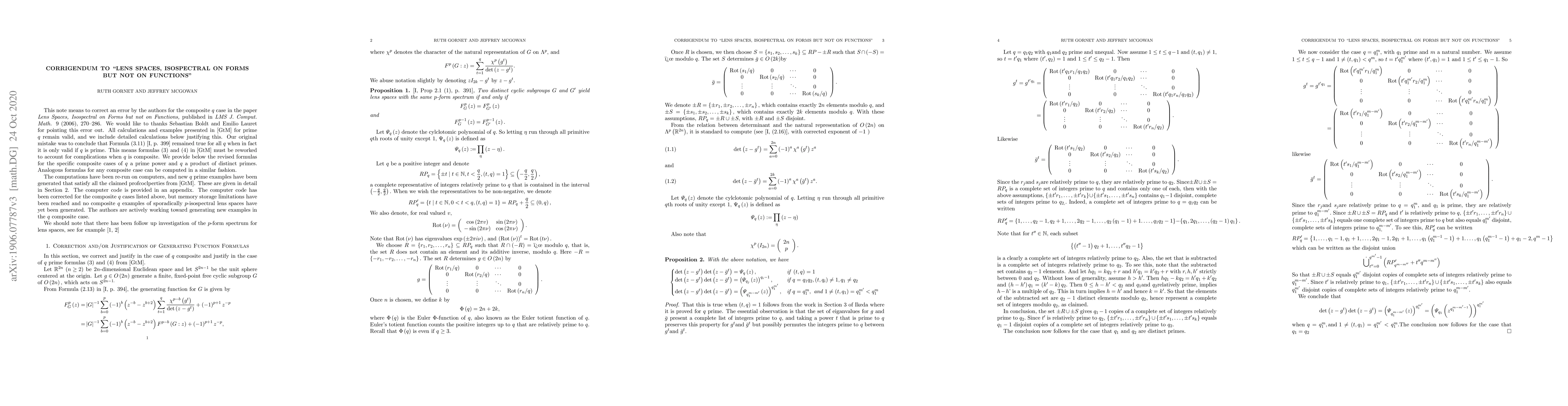 This paper means to correct an error by the authors for the composite $q$ case in the paper "Lens Spaces, Isospectral on Forms but not on Functions", published in LMS J. Comput. Math.} 9 (2006), 270-286. All calculations and examples presented in \cite{GM} for prime $q$ remain valid, and we include detailed calculations below justifying this. Our original mistake was to conclude that Formula (3.11) \cite[p. 399]{Ikeda} remained true for all $q$ when in fact it is only valid if $q$ is prime. This means formulas (3) and (4) in \cite{GM} must be reworked to account for complications when $q$ is composite.