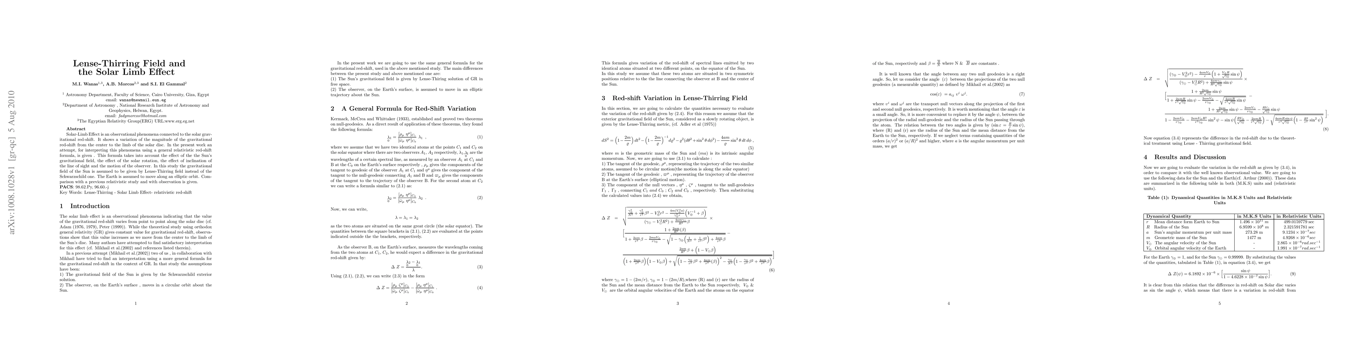 This research interprets the Solar Limb Effect, a variation in gravitational red-shift across the Sun's disc, using the Lense-Thirring field instead of Schwarzschild's solution. It considers the Sun's rotation, line of sight inclination, and observer's motion, comparing its findings with previous relativistic studies and observations.