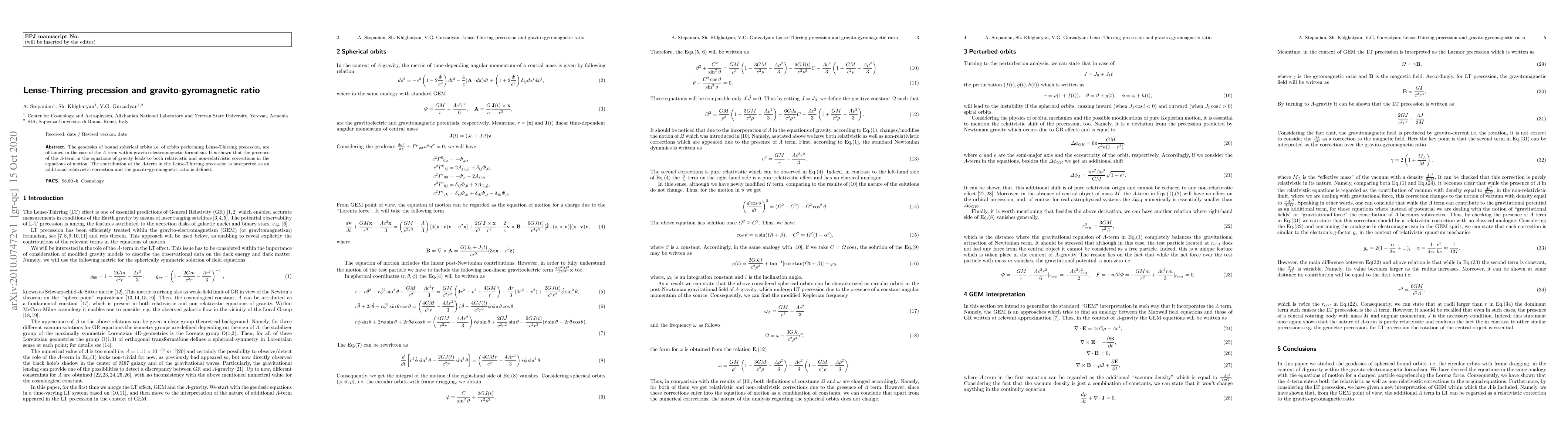 Researchers used gravito-electromagnetic formalism to study Lense-Thirring precession in bound spherical orbits, finding relativistic and non-relativistic corrections due to the $ u$ term in general relativity.