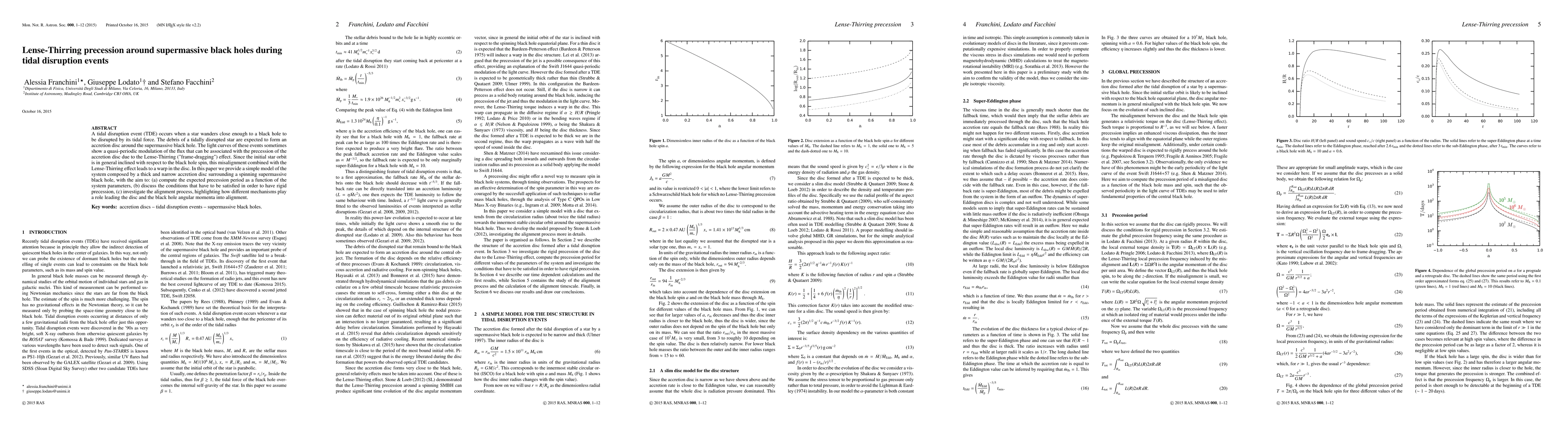 This paper explores the Lense-Thirring precession effect during tidal disruption events around supermassive black holes, modeling the accretion disc's warp and precession. It aims to compute the precession period and investigate the alignment process between the disc and black hole angular momenta.