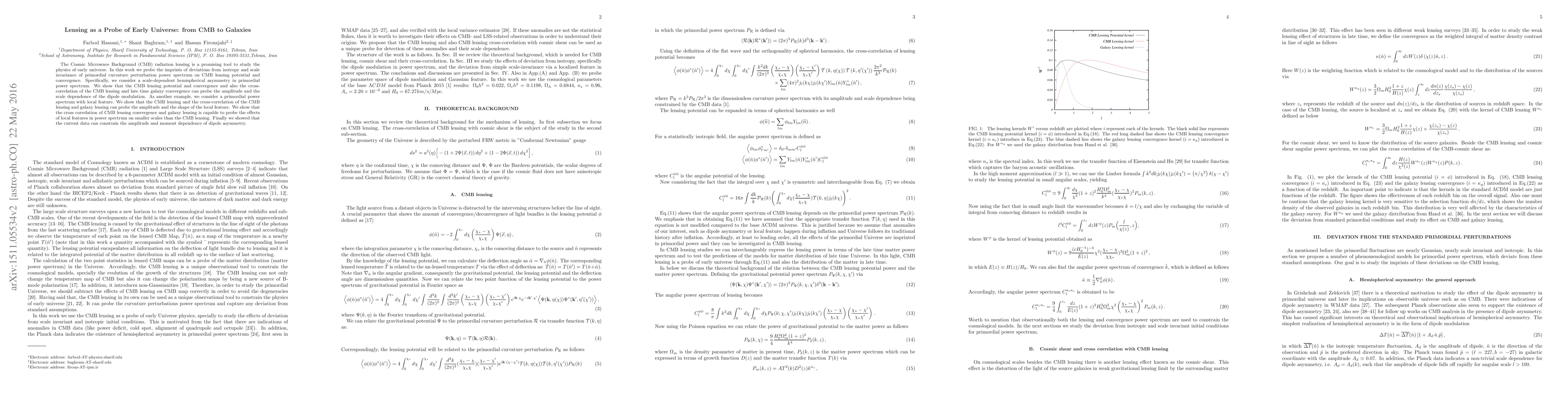 The Cosmic Microwave Background (CMB) radiation lensing is a promising tool to study the physics of early universe. In this work we probe the imprints of deviations from isotropy and scale invariance of primordial curvature perturbation power spectrum on CMB lensing potential and convergence. Specifically, we consider a scale-dependent hemispherical asymmetry in primordial power spectrum. We show that the CMB lensing potential and convergence and also the cross-correlation of the CMB lensing and late time galaxy convergence can probe the amplitude and the scale dependence of the dipole modulation. As another example, we consider a primordial power spectrum with local feature. We show that the CMB lensing and the cross-correlation of the CMB lensing and galaxy lensing can probe the amplitude and the shape of the local feature. We show that the cross correlation of CMB lensing convergence and galaxy lensing is capable to probe the effects of local features in power spectrum on smaller scales than the CMB lensing. Finally we showed that the current data can constrain the amplitude and moment dependence of dipole asymmetry.