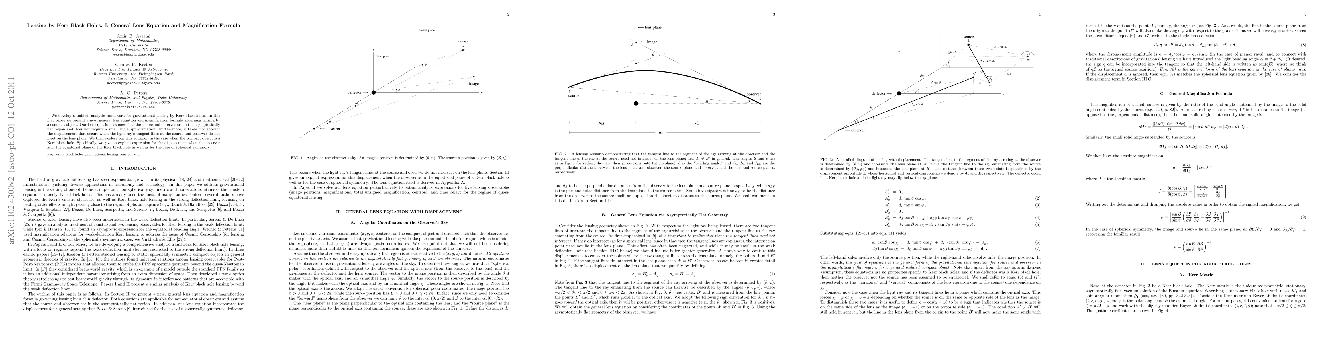We develop a unified, analytic framework for gravitational lensing by Kerr black holes. In this first paper we present a new, general lens equation and magnification formula governing lensing by a compact object. Our lens equation assumes that the source and observer are in the asymptotically flat region and does not require a small angle approximation. Furthermore, it takes into account the displacement that occurs when the light ray's tangent lines at the source and observer do not meet on the lens plane. We then explore our lens equation in the case when the compact object is a Kerr black hole. Specifically, we give an explicit expression for the displacement when the observer is in the equatorial plane of the Kerr black hole as well as for the case of spherical symmetry.
