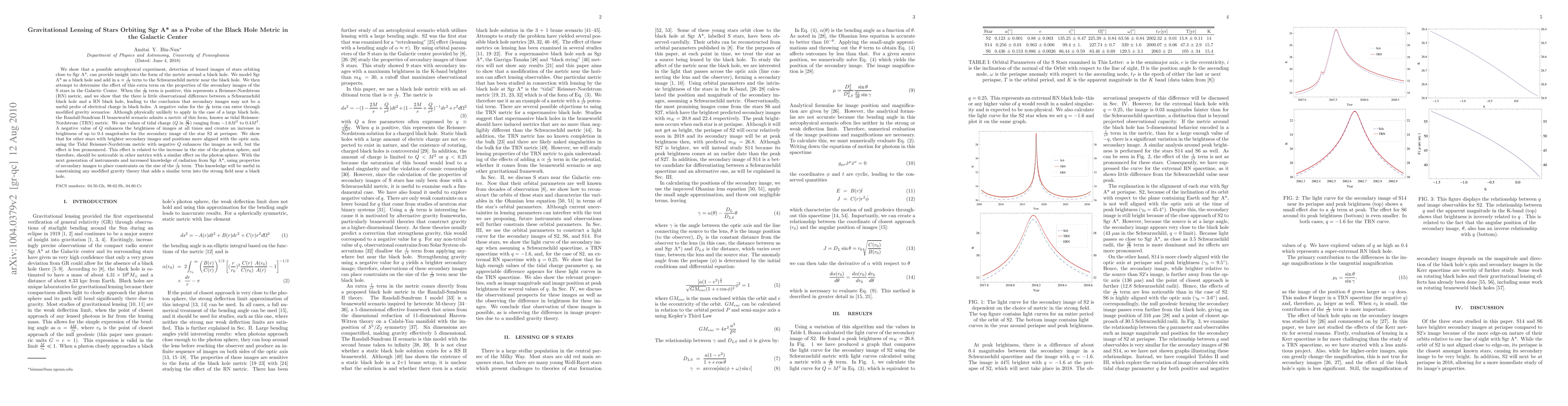 We show that a possible astrophysical experiment, detection of lensed images of stars orbiting close to Sgr A*, can provide insight into the form of the metric around a black hole. We model Sgr A* as a black hole and add in a $\frac{1}{r^2}$ term to the Schwarzschild metric near the black hole. We then attempt to determine the effect of this extra term on the properties of the secondary images of the S stars in the Galactic Center. When the $\frac{1}{r2}$ term is positive, this represents a Reissner-Nordstrom (RN) metric, and we show that the there is little observational difference between a Schwarzschild black hole and a RN black hole, leading to the conclusion that secondary images may not be a useful probe of electrical charge in black holes. A negative value for the $\frac{1}{r^2}$ term can enter through modified gravity scenarios. Although physically unlikely to apply in the case of a large black hole, the Randall-Sundrum II braneworld scenario admits a metric of this form, known as tidal Reissner- Nordstrom (TRN) metric. We use values of tidal charge (Q in $\frac{Q}{r^2}$) ranging from $-1.6M^2$ to $0.4 M^2$. A negative value of Q enhances the brightness of images at all times and creates an increase in brightness of up to 0.4 magnitudes for the secondary image of the star S2 at periapse. We show that for other stars with brighter secondary images and positions more aligned with the optic axis, using the Tidal Reissner-Nordstrom metric with negative Q enhances the images as well, but the effect is less pronounced. With the next generation of instruments and increased knowledge of radiation from Sgr A*, using properties of secondary images to place constraints on the size of the $\frac{1}{r^2}$ term. This knowledge will be useful in constraining any modified gravity theory that adds a similar term into the strong field near a black hole.