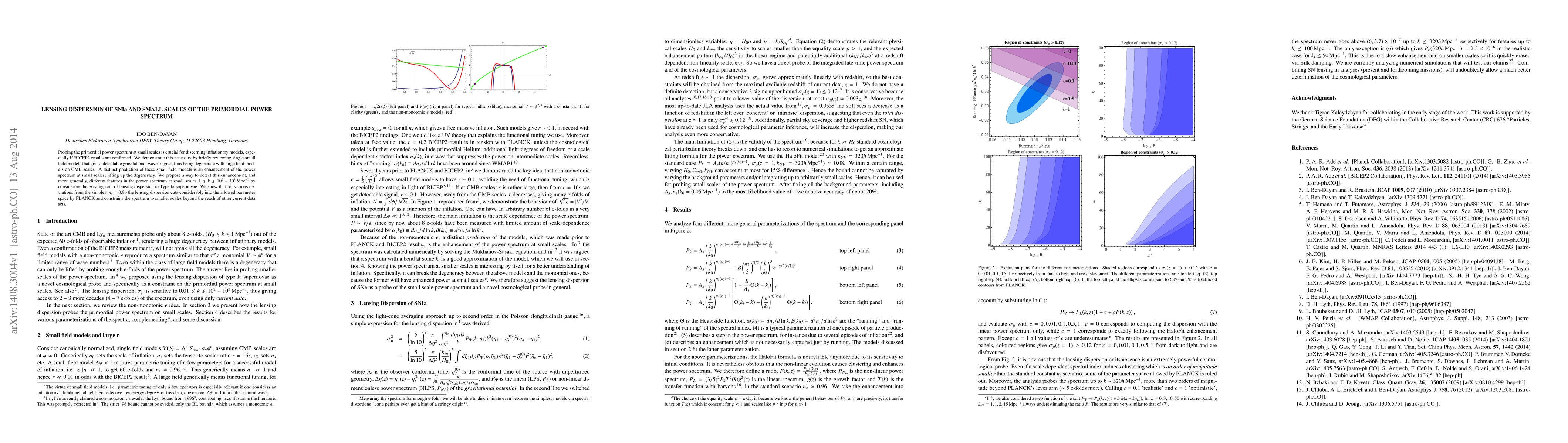 Probing the primordial power spectrum at small scales is crucial for discerning inflationary models, especially if BICEP2 results are confirmed. We demonstrate this necessity by briefly reviewing single small field models that give a detectable gravitational waves signal, thus being degenerate with large field models on CMB scales. A distinct prediction of these small field models is an enhancement of the power spectrum at small scales, lifting up the degeneracy. We propose a way to detect this enhancement, and more generally, different features in the power spectrum at small scales $1\lesssim k \lesssim 10^2-10^3 \,\mathrm{Mpc}^{-1}$ by considering the existing data of lensing dispersion in Type Ia supernovae. We show that for various deviations from the simplest $n_s\simeq 0.96$ the lensing dispersion cuts considerably into the allowed parameter space by PLANCK and constrains the spectrum to smaller scales beyond the reach of other current data sets.