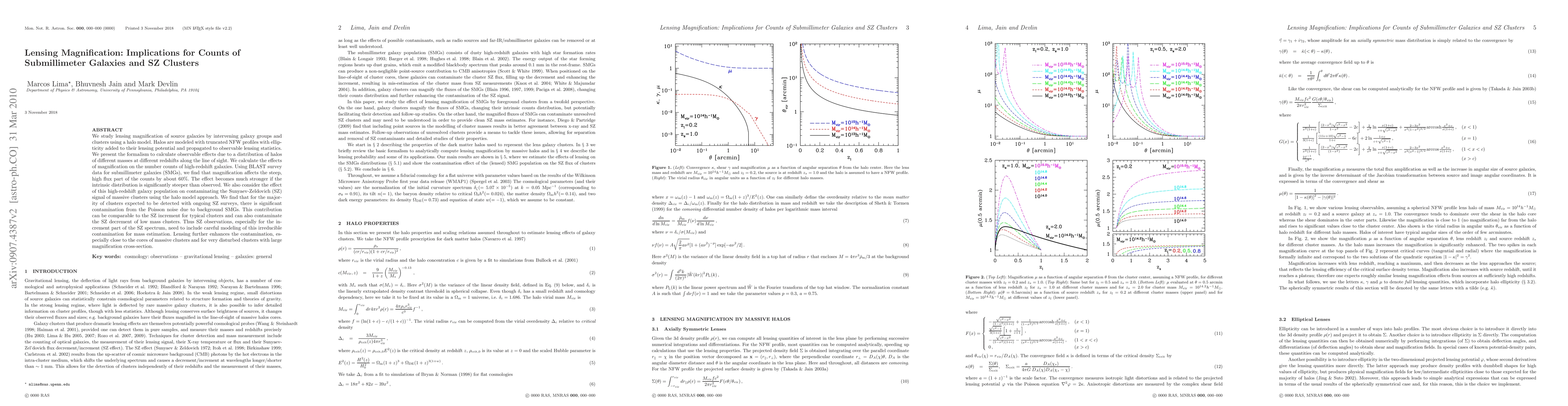 We study lensing magnification of source galaxies by intervening galaxy groups and clusters using a halo model. Halos are modeled with truncated NFW profiles with ellipticity added to their lensing potential and propagated to observable lensing statistics. We present the formalism to calculate observable effects due to a distribution of halos of different masses at different redshifts along the l ine of sight. We calculate the effects of magnification on the number counts of high-redshift galaxies. Using BLAST survey data for submillimeter galaxies (SMGs), we find that magnification affects the steep, high flux par t of the counts by about 60%. The effect becomes much stronger if the intrinsic distribution is signi ficantly steeper than observed. We also consider the effect of this high-redshift galaxy population on contaminating the Sunyaev-Zel'dovich (SZ) signal of massive clusters using the halo model approach. We find that for the majority of clusters expected to be detected with ongoing SZ surveys, there is significant contamination from the Poisson noise due to background SMGs. This contr ibution can be comparable to the SZ increment for typical clusters and can also contaminate the SZ decrement of low mass clusters. Thus SZ observations, especially for the increment part of the SZ spectrum, need to include careful modeling of this irreducible contamination for mass estimation. Lensing further enhances the contamination, especially close to the cores of massive clusters and for very disturbed clusters with large magnification cross-section.