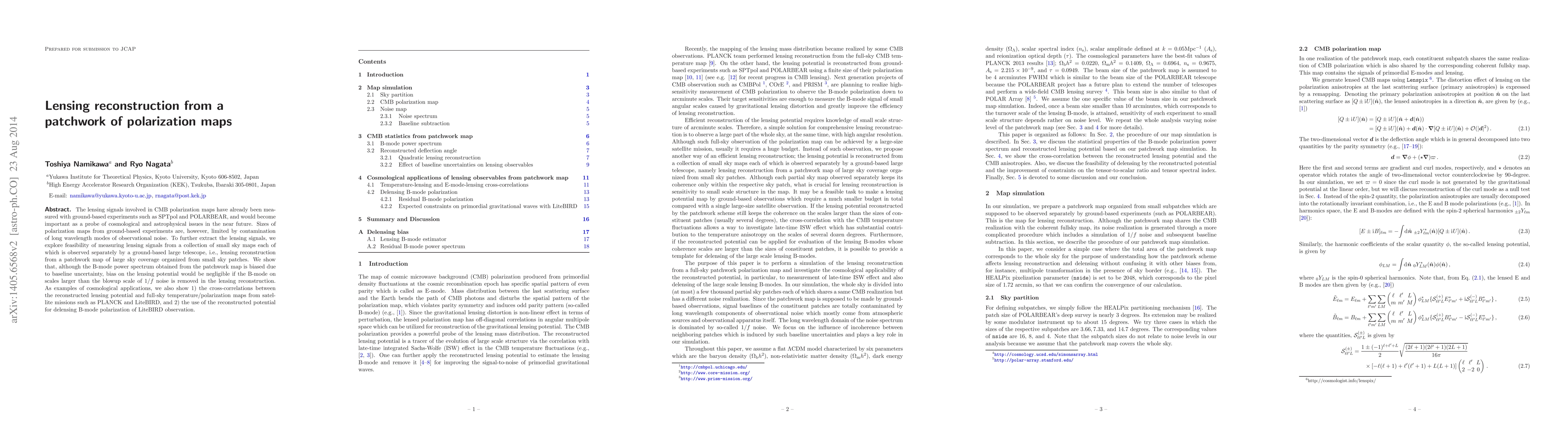 The lensing signals involved in CMB polarization maps have already been measured with ground-based experiments such as SPTpol and POLARBEAR, and would become important as a probe of cosmological and astrophysical issues in the near future. Sizes of polarization maps from ground-based experiments are, however, limited by contamination of long wavelength modes of observational noise. To further extract the lensing signals, we explore feasibility of measuring lensing signals from a collection of small sky maps each of which is observed separately by a ground-based large telescope, i.e., lensing reconstruction from a patchwork map of large sky coverage organized from small sky patches. We show that, although the B-mode power spectrum obtained from the patchwork map is biased due to baseline uncertainty, bias on the lensing potential would be negligible if the B-mode on scales larger than the blowup scale of $1/f$ noise is removed in the lensing reconstruction. As examples of cosmological applications, we also show 1) the cross-correlations between the reconstructed lensing potential and full-sky temperature/polarization maps from satellite missions such as PLANCK and LiteBIRD, and 2) the use of the reconstructed potential for delensing B-mode polarization of LiteBIRD observation.