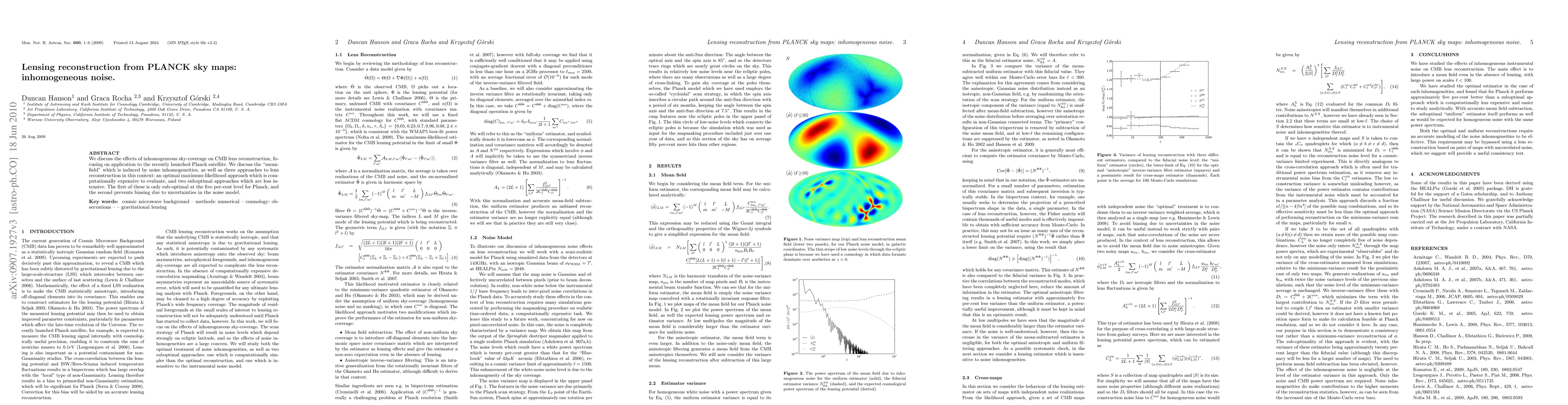 We discuss the effects of inhomogeneous sky-coverage on CMB lens reconstruction, focusing on application to the recently launched Planck satellite. We discuss the mean-field which is induced by noise inhomogeneities, as well as three approaches to lens reconstruction in this context: an optimal maximum-likelihood approach which is computationally expensive to evaluate, and two suboptimal approaches which are less intensive. The first of these is only sub-optimal at the five per-cent level for Planck, and the second prevents biasing due to uncertainties in the noise model.