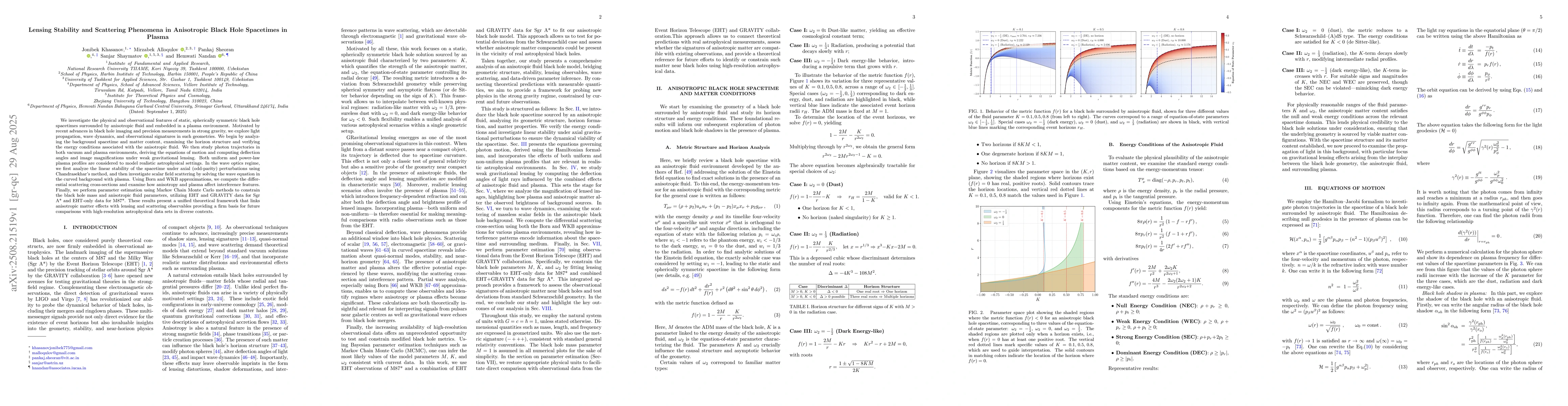 We investigate the physical and observational features of static, spherically symmetric black hole spacetimes surrounded by anisotropic fluid and embedded in a plasma environment. Motivated by recent advances in black hole imaging and precision measurements in strong gravity, we explore light propagation, wave dynamics, and observational signatures in such geometries. We begin by analyzing the background spacetime and matter content, examining the horizon structure and verifying the energy conditions associated with the anisotropic fluid. We then study photon trajectories in both vacuum and plasma environments, deriving the equations of motion and computing deflection angles and image magnifications under weak gravitational lensing. Both uniform and power-law plasma profiles are considered to model realistic astrophysical settings. In the wave optics regime, we first analyze the linear stability of the spacetime under axial (odd-parity) perturbations using Chandrasekhar's method, and then investigate scalar field scattering by solving the wave equation in the curved background with plasma. Using Born and WKB approximations, we compute the differential scattering cross-sections and examine how anisotropy and plasma affect interference features. Finally, we perform parameter estimation using Markov Chain Monte Carlo methods to constrain the black hole mass and anisotropic fluid parameters, utilizing EHT and GRAVITY data for Sgr A* and EHT-only data for M87*. These results present a unified theoretical framework that links anisotropic matter effects with lensing and scattering observables providing a firm basis for future comparisons with high-resolution astrophysical data sets in diverse contexts.