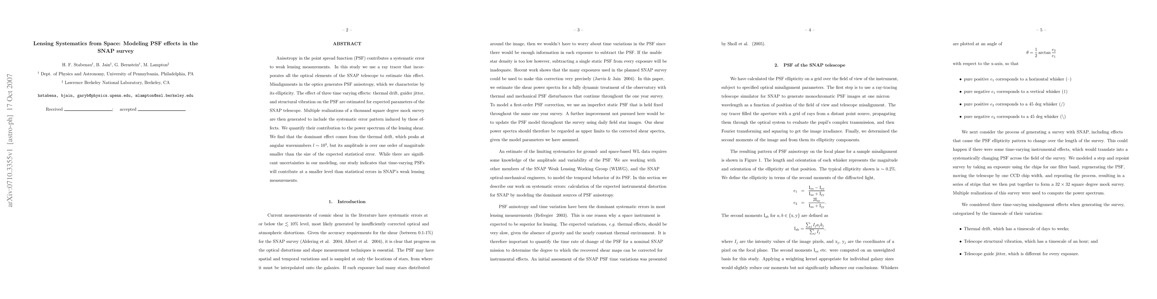 This study models the systematic error in weak lensing measurements caused by anisotropy in the point spread function (PSF) of the SNAP telescope, finding that thermal drift is the most significant effect but remains smaller than statistical errors. The research uses a ray tracer to simulate the effects of thermal drift, guider jitter, and structural vibration on the PSF.