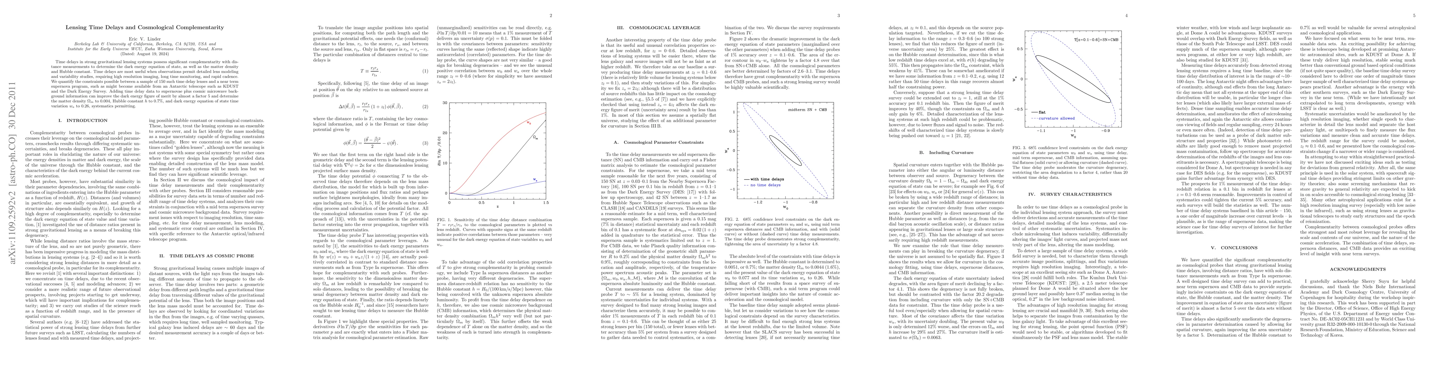 Time delays in strong gravitational lensing systems possess significant complementarity with distance measurements to determine the dark energy equation of state, as well as the matter density and Hubble constant. Time delays are most useful when observations permit detailed lens modeling and variability studies, requiring high resolution imaging, long time monitoring, and rapid cadence. We quantify the constraints possible between a sample of 150 such time delay lenses and a near term supernova program, such as might become available from an Antarctic telescope such as KDUST and the Dark Energy Survey. Adding time delay data to supernovae plus cosmic microwave background information can improve the dark energy figure of merit by almost a factor 5 and determine the matter density \Omega_m to 0.004, Hubble constant h to 0.7%, and dark energy equation of state time variation w_a to 0.26, systematics permitting.