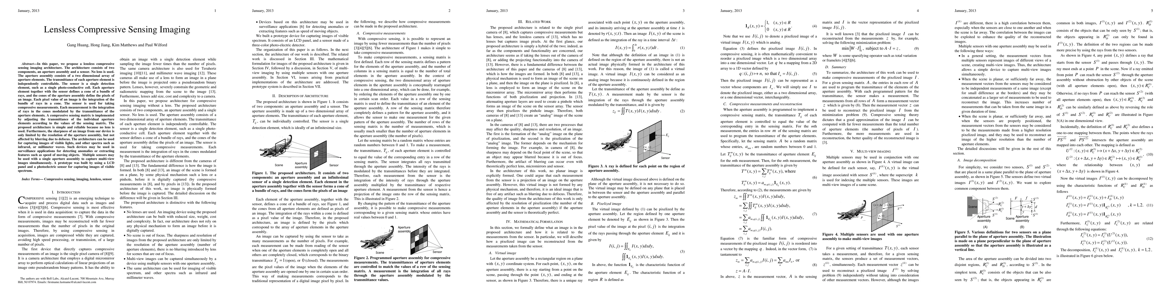 This paper introduces a lensless compressive sensing imaging system using an aperture assembly and a single sensor to capture images without lenses. The design avoids defocus blur, relying on the resolution of the aperture elements for image sharpness, and can capture various spectra for surveillance applications.