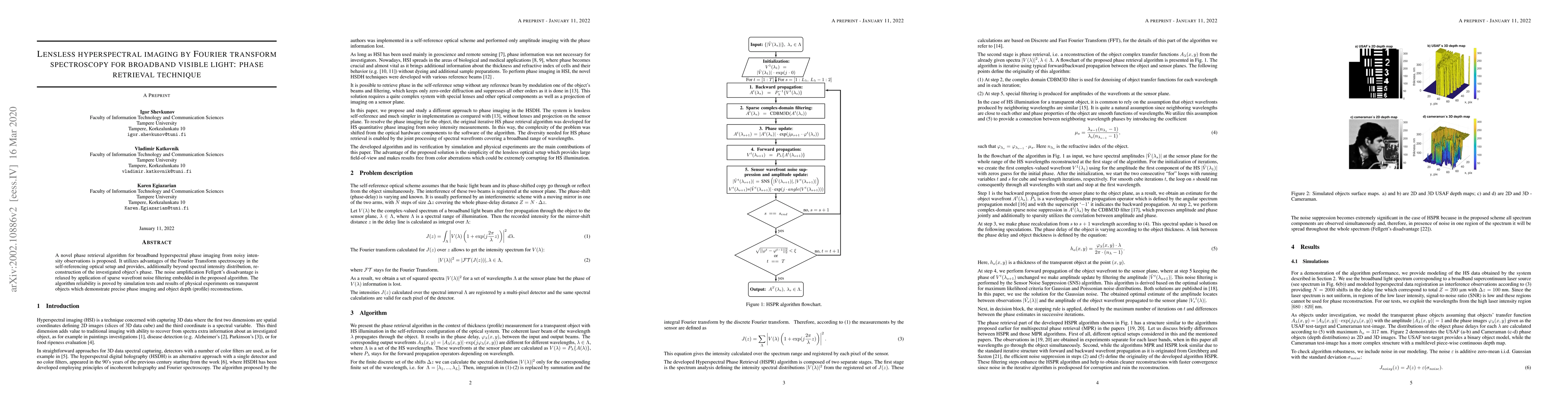 A novel phase retrieval algorithm for broadband hyperspectral phase imaging from noisy intensity observations is proposed. It utilizes advantages of the Fourier Transform spectroscopy in the self-referencing optical setup and provides, additionally beyond spectral intensity distribution, reconstruction of the investigated object's phase. The noise amplification Fellgett's disadvantage is relaxed by the application of sparse wavefront noise filtering embedded in the proposed algorithm. The algorithm reliability is proved by simulation tests and results of physical experiments on transparent objects which demonstrate precise phase imaging and object depth (profile) reconstructions.