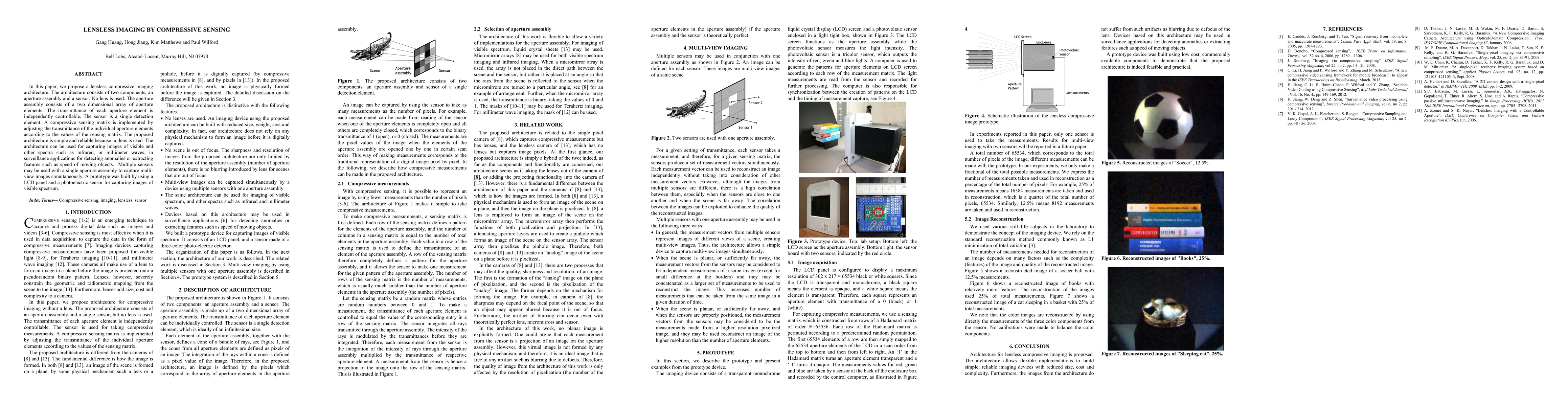 This paper introduces a lensless compressive imaging system using an array of controllable apertures and a single sensor, enabling image capture without lenses. The system leverages compressive sensing to reconstruct images, suitable for surveillance applications across various spectra.