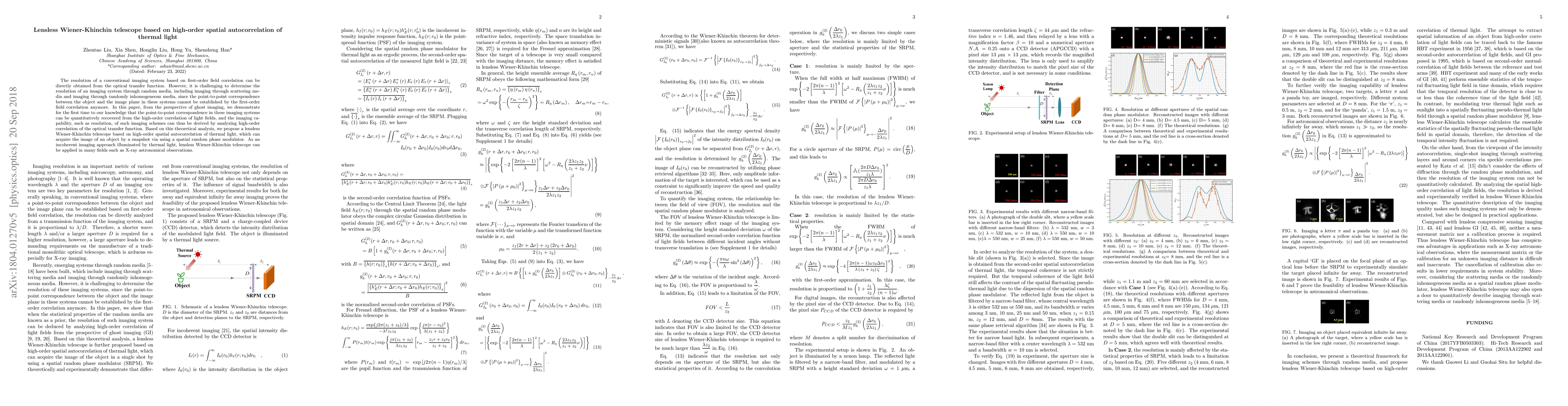 The resolution of a conventional imaging system based on first-order field correlation can be directly obtained from the optical transfer function. However, it is challenging to determine the resolution of an imaging system through random media, including imaging through scattering media and imaging through randomly inhomogeneous media, since the point-to-point correspondence between the object and the image plane in these systems cannot be established by the first-order field correlation anymore. In this paper, from the perspective of ghost imaging, we demonstrate for the first time to our knowledge that the point-to-point correspondence in these imaging systems can be quantitatively recovered from the high-order correlation of light fields, and the imaging capability, such as resolution, of such imaging schemes can thus be derived by analyzing high-order correlation of the optical transfer function. Based on this theoretical analysis, we propose a lensless Wiener-Khinchin telescope based on high-order spatial autocorrelation of thermal light, which can acquire the image of an object by a snapshot via using a spatial random phase modulator. As an incoherent imaging approach illuminated by thermal light, lensless Wiener-Khinchin telescope can be applied in many fields such as X-ray astronomical observations.