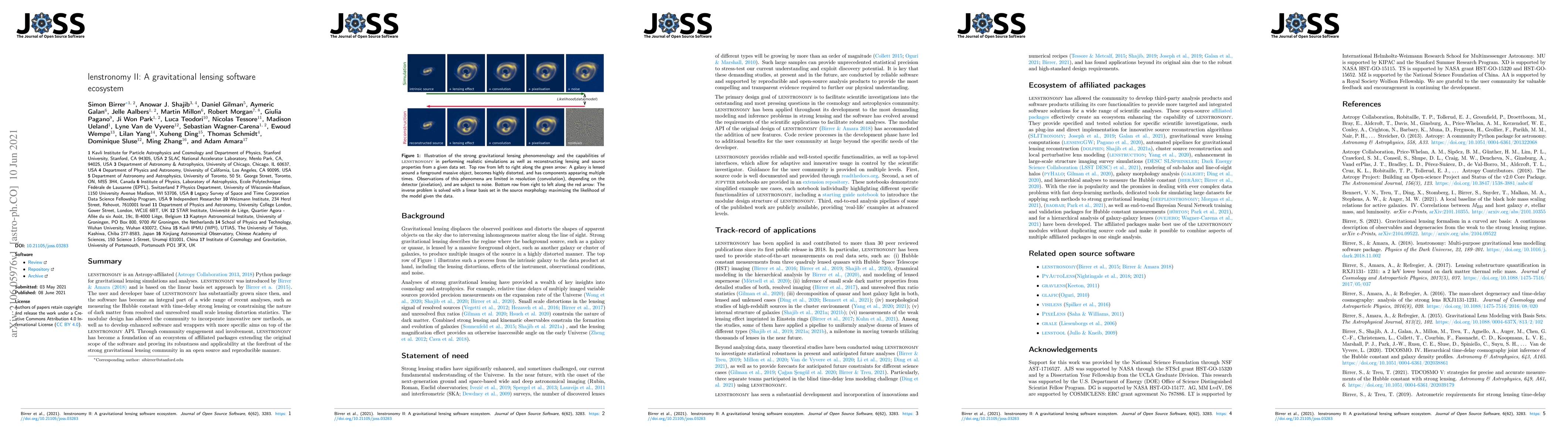 lenstronomy is an open-source Python package for gravitational lensing simulations and analyses, which has grown into a robust ecosystem through community contributions and involvement. It serves as a foundation for various affiliated packages, enhancing its scope and application in cutting-edge research.
