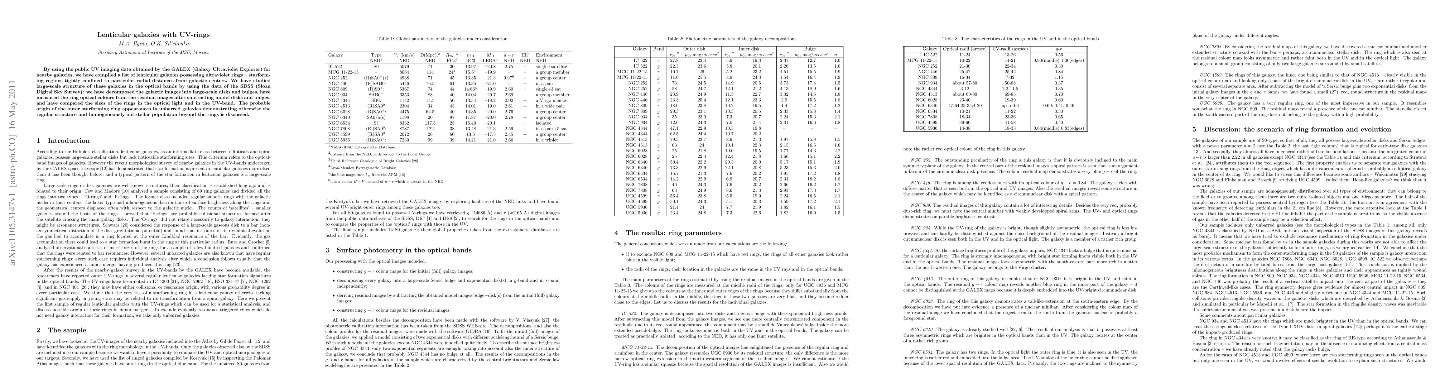 By using the public UV imaging data obtained by the GALEX (Galaxy Ultraviolet Explorer) for nearby galaxies, we have compiled a list of lenticular galaxies possessing ultraviolet rings - starforming regions tightly confined to particular radial distances from galactic centers. We have studied large-scale structure of these galaxies in the optical bands by using the data of the SDSS (Sloan Digital Sky Survey): we have decomposed the galactic images into large-scale disks and bulges, have measured the ring optical colours from the residual images after subtracting model disks and bulges, and have compared the sizes of the rings in the optical light and in the UV-band. The probable origin of the outer starforming ring appearances in unbarred galaxies demonstrating otherwise the regular structure and homogeneously old stellar population beyond the rings is discussed.
