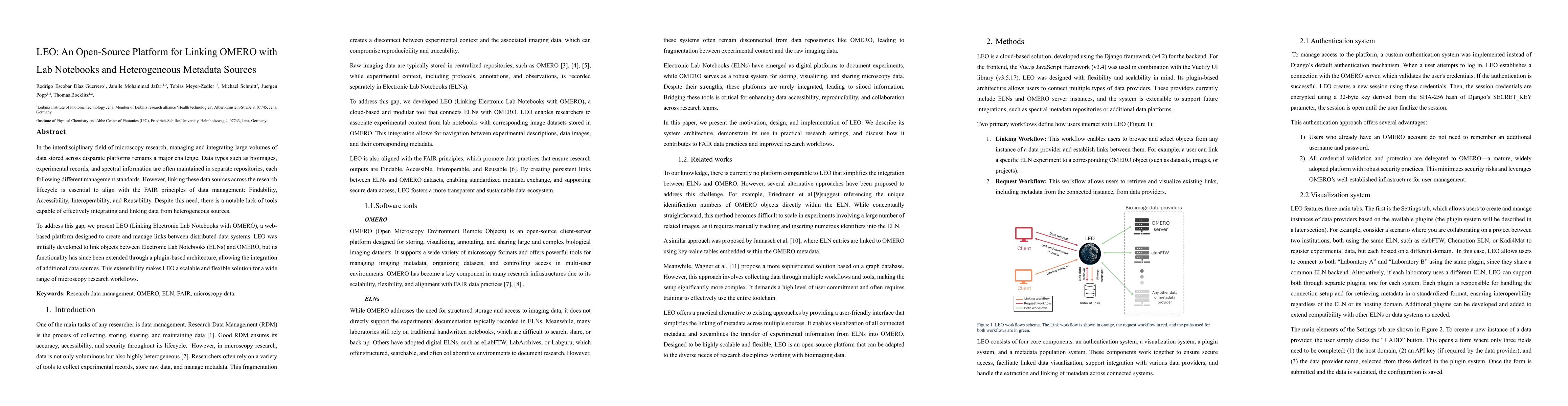 In the interdisciplinary field of microscopy research, managing and integrating large volumes of data stored across disparate platforms remains a major challenge. Data types such as bioimages, experimental records, and spectral information are often maintained in separate repositories, each following different management standards. However, linking these data sources across the research lifecycle is essential to align with the FAIR principles of data management: Findability, Accessibility, Interoperability, and Reusability. Despite this need, there is a notable lack of tools capable of effectively integrating and linking data from heterogeneous sources. To address this gap, we present LEO (Linking Electronic Lab Notebooks with OMERO), a web-based platform designed to create and manage links between distributed data systems. LEO was initially developed to link objects between Electronic Lab Notebooks (ELNs) and OMERO, but its functionality has since been extended through a plugin-based architecture, allowing the integration of additional data sources. This extensibility makes LEO a scalable and flexible solution for a wide range of microscopy research workflows.