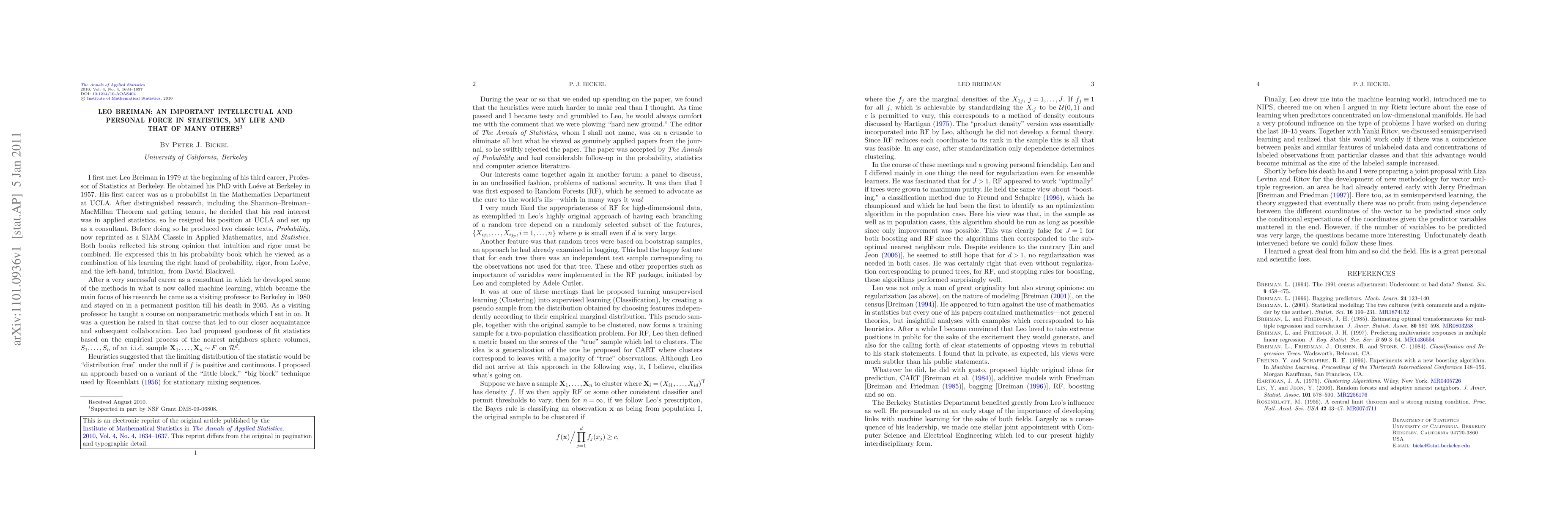 This paper honors Leo Breiman's contributions to statistics, including his influential works on probability and statistics that emphasize the importance of combining intuition with rigor. It highlights his career transitions from probabilist to applied statistician and his impact on the field of statistics.